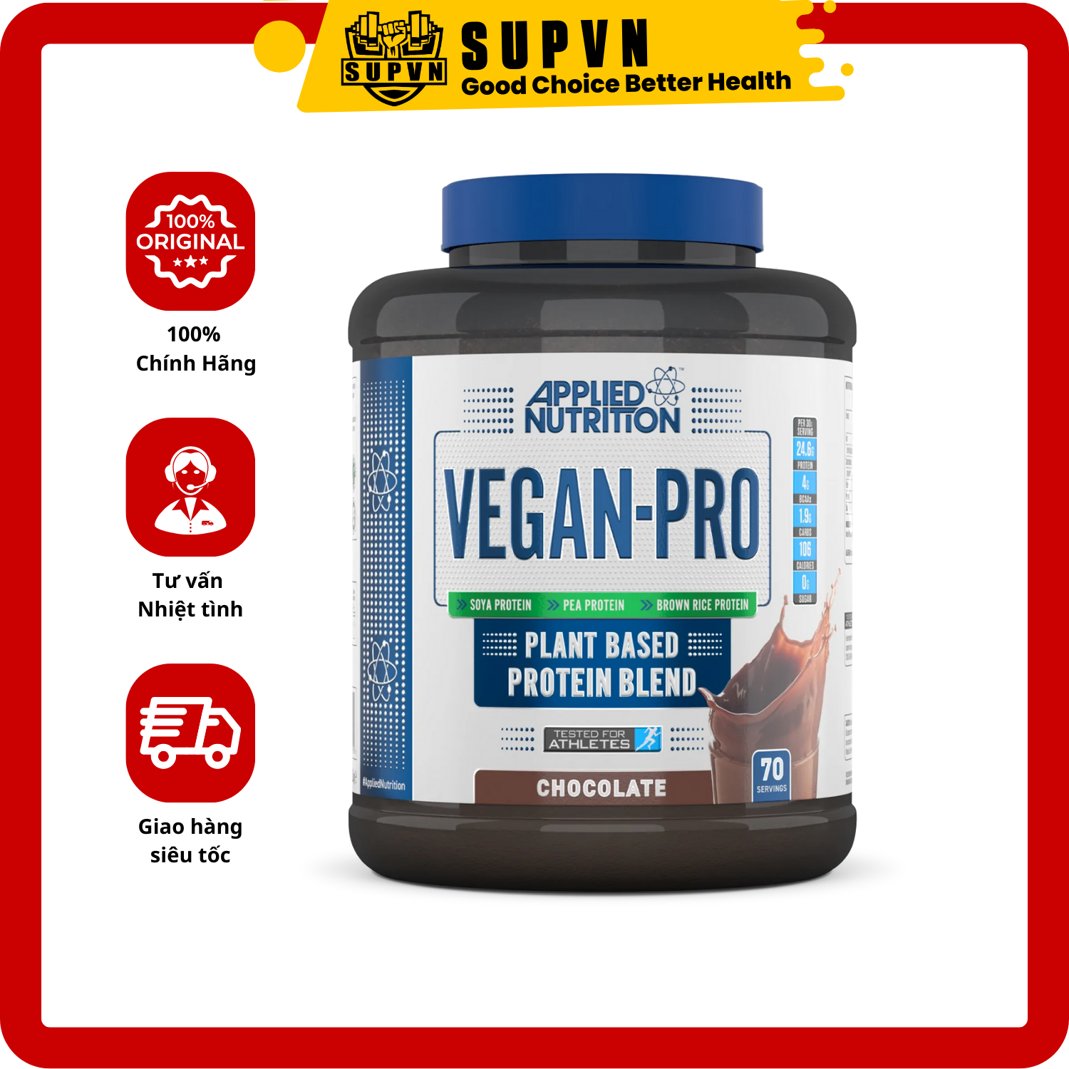 Vegan Pro Applied Nutrition - Nguồn dinh dưỡng hoàn hảo cho người ăn chay Vegan Pro Applied Nutriton là sản phẩm cung cấp protein quan trọng cho chế độ ăn thuần chay. Nó đến từ thương hiệu Applied Nutriton, một trong những nhà cung cấp thực phẩm bổ sung nổi tiếng tại Anh. Tại sao nên chọn Vegan Pro Applied Nutriton? Vegan Pro Applied Nutriton là sự lựa chọn hoàn hảo cho nhiều đối tượng, đặc biệt là những người ăn chay. Bạn nên bổ sung sản phẩm này vào chế ăn hằng ngày của mình vì: Nhiều công dụng vượt trội được kết hợp trong một sản phẩm Nhiều công dụng vượt trội Hỗ trợ đắc lực trong quá trình tăng cân, giảm mỡ.Tạo cảm giác no lâu đồng thời hạn chế cơn thèm ăn.Giúp xây dựng và phục hồi cơ bắp sau tập luyện.Cung cấp đến 22 loại amino acid giúp cơ bắp phát triển.Giúp da sáng đẹp hơn, hạn chế nóng trong người và nổi mụn.Thành phần sản phẩm không chứa cholesterol và chất béo giảm thiểu nguy cơ mắc bệnh tim mạch và mỡ máu. Vegan Pro - hỗn hợp protein thuần chay chất lượng cao Vegan Pro Applied Nutriton được kết hợp giữa Protein đậu nành, Protein hạt đậu, protein cây gai dầu và Protein gạo. Qua đó mang đến nguồn protein cao cấp với đầy đủ các axit amin thiết yếu. Whey thực vật chất lượng cao Sản phẩm này phù hợp với những người đang ăn chay trường muốn bổ sung thêm protein cho cơ thể. Nó hỗ trợ đắc lực trong việc tăng trưởng và duy trì khối lượng cơ. Sự kết hợp tuyệt vời của các axit amin chuỗi nhánh cao Sản phẩm có sự góp mặt của leucine, isoleucine và valine. Theo đánh giá của các chuyên gia, đây là những chất không thể thiếu trong quá trình tăng trưởng và duy trì khối lượng cơ. Đặc biệt là đối với các cá nhân có chế độ ăn thuần chay. Applied Nutrition - Doanh nghiệp cung cấp TPBS hàng đầu tại Anh Quốc Thương hiệu hàng đầu Anh Quốc Sau bao nỗ lực và cố gắng, Applied Nutrition đang dần trở thành một trong những thương hiệu cung cấp thực phẩm bổ sung đáng tin cậy nhất thế giới. Với đội ngũ những người đam mê dinh dưỡng thể thao, đơn vị này đang tạo ra những sản phẩm mới mang tính cách mạng trên thị trường. Có mặt trên 65 quốc gia toàn thế giới và được sử dụng bởi nhiều vận động viên nổi tiếng Applied Nutrition hẳn là sự lựa chọn hoàn hảo cho nhiều người. Những điều cần lưu ý khi sử dụng Vegan Pro Applied Nutrition Sử dụng sản phẩm một cách tùy tiện, không đọc kỹ hướng dẫn và lưu ý của nhà sản xuất là lỗi à nhiều người gặp phải. Đừng bỏ qua những thông tin giá trị sau nếu bạn muốn sản phẩm của mình phát huy được các công dụng tối ưu. Tham khảo ý kiến các chuyên giá nếu bạn đang thuộc đối tượng: đang mang thai hoặc cho con bú, dưới 18 tuổi và có tiền sử bệnh lý.Sử dụng sản phẩm kết hợp với chế độ ăn uống đa dạng và một lối sống lành mạnh.Tuyệt đối không nên sử dụng quá liều lượng được nhà sản xuất khuyến cáo.Bảo quản sản phẩm ở nơi khô ráo, thoáng mát, tránh xa tầm với của trẻ nhỏ.Ngưng sử dụng nếu sản phẩm có dấu hiệu chuyển màu hoặc có mùi khác thường. Vegan Pro Applied Nutrition phù hợp với những ai? Vegan Pro Applied Nutrition sử dụng được cho đa dạng đối tượng nhưng không phải ai cũng phù hợp để sử dụng sản phẩm này. Đừng bỏ qua những ý sau để biết liệu bạn có nằm trong danh sách những người phù hợp với sản phẩm không nhé! Những cá nhân ăn chay nhưng vẫn muốn bổ sung protein vào thực đơn của mình để xây dựng cơ bắp và duy trì chế độ ăn uống lành mạnh.Các vận động viên đang phải ăn thuần chay theo giáo án đặc biệt.Những đối tượng không thích hoặc không hợp với whey proteinNhững người bị cao mỡ máu hay cao huyết ápGiá sản phẩm trên Tiki đã bao gồm thuế theo luật hiện hành. Bên cạnh đó, tuỳ vào loại sản phẩm, hình thức và địa chỉ giao hàng mà có thể phát sinh thêm chi phí khác như phí vận chuyển, phụ phí hàng cồng kềnh, thuế nhập khẩu (đối với đơn hàng giao từ nước ngoài có giá trị trên 1 triệu đồng).....