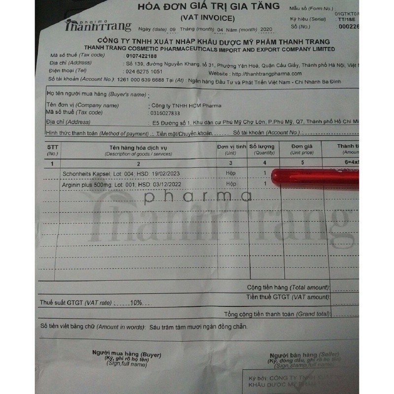 🔰 𝐀𝐑𝐆𝐈𝐍𝐈𝐍 𝐏𝐋𝐔𝐒 🔰 ♻️ 𝐓𝐡𝐚̀𝐧𝐡 𝐩𝐡𝐚̂̀𝐧: L-Arginin: 500 mg Vitamin C: 40 mg Vitamin B1: 550 mcg Vitamin B12: 1.25 mcg Phụ liệu: Gelatin, Magnesium stearate vừa đủ 1 viên 648 mg. 📌 L- Arginin là một Axit amin bán thiết yếu, giúp làm giảm nồng độ Amoniac trong máu ngăn ngừa tình trạng hôn mê gan do nồng độ Amoniac quá cao. Bổ gan Arginin tăng tạo Glutathion do đó tăng chuyển hóa các chất độc đối với tế bào gan hiệu quả, bảo vệ gan đặc biệt là màng tế bào, làm giảm đáng kể nồng độ các men gan trong huyết thanh. 📌 Các Vitamin B6 (1mg), B12 (1mcg), Axit Forlic (100mcg) có tác dụng phòng thiếu hụt Vitamin B6, dẫn đến thiếu máu đơn lẻ, viêm dây thần kinh ngoại biên, viêm da tăng bã nhờn, khô nứt môi. Thiếu Axit Forlic, Vitamin B12 gây ra thiếu máu, rối loạn cảm giác, rối loạn trí nhớ và tâm thần. Do dó, các Vitamin B12, Axit Forlic hấp thụ được bệnh Biermer, dạ dày bị cắt, rối loạn cuối hồi tràng bị cắt, thiếu máu u sắc hồng cầu to, viêm đau dây thần kinh, ngoài ra còn phối hợp với các loại Vitamin khác khi cơ thể bị suy nhược, suy dinh dưỡng trẻ em, phụ nữ mang thai, nhiễm khuẩn, nhiễm độc. ⭕ Do vậy sử dụng Arginin kết hợp với Axit Folic và các Vitamin nhóm B là một giải pháp tối ưu giúp bảo vệ gan đã được kiểm chứng rõ ràng, được người tiêu dùng tin tưởng sử dụng suốt bao năm qua. ♻️ 𝗖𝗼̂𝗻𝗴 𝗱𝘂̣𝗻𝗴: ✔️ Hỗ trợ cải thiện chức năng gan. ✔️ Hỗ trợ hạ men gan, ✔️ Tăng cường bảo vệ gan cho những người gan nhiễm mỡ, sử dụng kháng sinh dài ngày, uống nhiều rượu bia. ♻️ Đ𝗼̂́𝗶 𝘁𝘂̛𝗼̛̣𝗻𝗴 𝘀𝘂̛̉ 𝗱𝘂̣𝗻𝗴: - Dùng cho người bị các chứng bệnh về gan, chức năng gan suy giảm, uống nhiều bia rượu. - Người uống nhiều thuốc có hại cho gan. - Người mệt mỏi căng thẳng, chán ăn, men gan cao, chuyển hóa kém. ♻️ 𝗖𝗮́𝗰𝗵 𝗱𝘂̀𝗻𝗴: - Liều thông thường uống mỗi lần 1 viên, ngày 1lần sau ăn 1 giờ. - Liều tham khảo Dược sĩ, Bác sĩ: ngày 2 viên sau ăn 1h với lượng nước vừa đủ. - Các trường hợp khác tham khảo ý kiến của Bác sĩ, Dược sĩ. ♻️ 𝗕𝗮̉𝗼 𝗾𝘂𝗮̉𝗻: - Tránh ánh nắng trực tiếp, bảo quản nơi khô ráo. - Để xa tầm tay trẻ em. - Không sử dụng sản phẩm nếu có mẫn cảm với bất kỳ thành phần nào của sản phẩm. ♻️ 𝗛𝗮̣𝗻 𝘀𝘂̛̉ 𝗱𝘂̣𝗻𝗴: 3 năm kể từ ngày sản xuất, ngày sản xuất và hạn sử dụng in trên bao bì của sản phẩm. ⚠️ Sản phẩm này không phải là thuốc, không có tác dụng thay thế thuốc chữa bệnh. ------------------------------------------------- ☢️ Thông tin về 𝐒𝐀𝐍𝐂𝐓 𝐁𝐄𝐑𝐇𝐀𝐑𝐃 - Là hãng dược mỹ phẩm nổi tiếng lâu đời từ Cộng hòa liên bang ĐỨC. - Ra đời tại Đức từ năm 1903 với hơn 117 năm kinh nghiệm đồng hành cùng sức khỏe. - Là một trong những thương hiệu lâu đời và có chất lượng sản phẩm tốt bậc nhất Châu Âu. - Được phân phối tại hơn 100 Quốc gia trên thế giới trong đó có hơn 30 nước Châu Âu. - Sản phẩm được phân phối độc quyền tại Việt Nam bời Công ty TNHH XNK DƯỢC MỸ PHẨM THANH TRANG