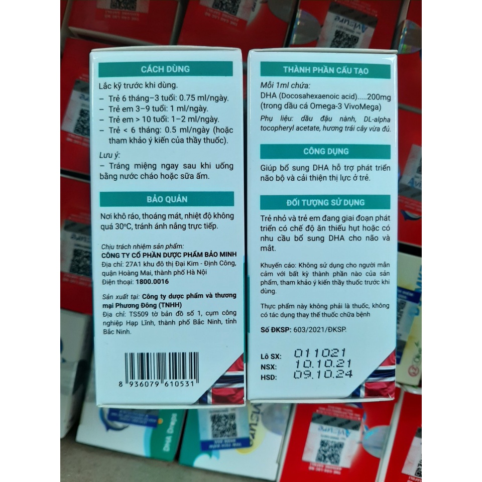 MÔ TẢ SẢN PHẨM Avisure DHA Smart Kid - ✅ Hàng Chính Hãng 100% - ✅ Có Hóa Đơn Đỏ - ✅ HSD: Mới Nhất ✅ Chú ý : " Sản phẩm ko phải là thuốc và không có tác dụng thay thế thuốc chữa bệnh " ✅ Thành Phần: Avisure DHA Smart Kid Mỗi 1ml chứa: DHA (Docosahexaenoic acid): 200mg trong đó dầu cá Omega- 3 VivoMega) Phụ liệu: Dầu đậu nành, Dl-alpha tocopheryl acetate, hương trái cây vừa đủ. ✅ Công Dụng: Avisure DHA Smart Kid - Giúp bổ sung DHA hỗ trợ phát triển não bộ và cải thiện thị lực ở trẻ. ✅ Đối Tượng Sử Dụng: Avisure DHA Smart Kid - Trẻ nhỏ và trẻ em đang trong giai đoạn phát triển có chế độ ăn thiếu hụt hoặc có nhu cầu bổ sung DHA cho não và mắt. ✅ Cách Dùng: Avisure DHA Smart Kid - Trẻ 6 tháng- 3 tuổi: 0.75ml/ngày. - Trẻ 3-9 tuổi: 1ml/ngày. - Trẻ > 10 tuổi: 1-2ml/ngày. - Trẻ em < 6 tháng: 0,5ml/ngày (hoặc tham khảo ý kiến người có chuyên môn). Tráng miệng ngay sau khi uống bằng nước cháo hoặc sữa ấm. ✅ Chú ý: - Không dùng cho người mẫn cảm với bất kỳ thành phần nào của sản phẩm - Sản phẩm không phải là thuốc và không có tác dụng thay thế thuốc chữa bệnh. #dha #epa_dha #omega_3_dha #omega_3_epa_dha #dha_cho_bé #bio_island_dha #omega_dha #dha_healthy_care #dha_500 #dha_drop #dha_kids #vitamine #avisure_dha_smart kid #avisure #smart #kid #avisure_dha_smart_kid #dha_smart_kid
