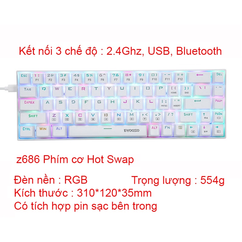 Mẫu: E-yooso Z-686 HOTSWAP Switch: Huano Blue Switch Màu sắc: Trắng Loại keycap: Keycap 1 màu PBT Hiệu ứng ánh sáng: RGB Giao diện: Cáp USB Type-c , USB 2.4ghz, Bluetooth Size: 310 x 120 x 35 mm Pin : 2000mah Khả năng tương thích hệ thống: Dành cho win XP/7/8/10, và Mac 10.2 trở lên. Kích thước sản phẩm: 400 x 330 x 350 mm / 14.17 x 5.12 x 1.42". - Các tính năng ưu điểm: 🎹 Keycap đúc hai màu không dễ mài mòn và đường cong keycap theo từng bước công thái học có độ bền cao. 🎹 Tất cả các phím nổi không có xung đột. 🎹 Bàn phím trục xanh cơ học, bố cục phím cao và thấp, cảm giác tay tốt hơn và khả năng chơi game. 🎹 Một loạt các hiệu ứng ánh sáng tuyệt vời: đèn nền LED cầu vồng rực rỡ đầy màu sắc có thể mang đến cho bạn một bầu không khí chơi game tuyệt vời. Có hệ thống chiếu sáng thường trực và đèn thở tự động. Mỗi keycap đều được chiếu sáng, cho phép bạn chơi thoải mái trong bóng tối. 🎹 Cắm vào và chơi, không cần cài đặt app, phù hợp với mọi game thủ.