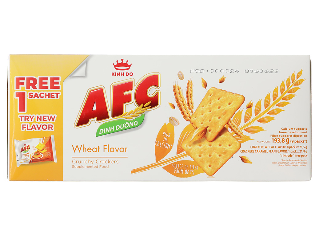 Với sản phẩm tươi sống, trọng lượng thực tế có thể chênh lệch khoảng 10%. Bánh AFC Dinh Dưỡng Vị Lúa Mì - Hộp 193.8G Loại: Bánh quy lúa mì Khối lượng: 193.8G Năng lượng: 507 - 521kcal /100g Điểm nổi bật: Giàu Canxi, Vitamin D, có bổ sung chất xơ yến mạch Thành phần: Bột mì, dầu thực vật (dầu cọ), đường, chất xơ yến mạch 4%, có chứa gluten (yến mạch), whey bột, mạch nha, chất tạo xốp, chất béo thay thế bơ, muối, calci carbonat, Phù hợp: Trẻ em từ 4 tuổi trở lên Công dụng: Sản phẩm có bổ sung canxi và vitamin D - hỗ trợ xương chắc khỏe và hấp thụ canxi tốt hơn Bảo quản: Để nơi khô ráo, thoáng mát, tránh ánh nắng trực tiếp Lưu ý: Sản phẩm có chứa lúa mì, sữa và đậu nành Thương hiệu: AFC Nơi sản xuất: Việt Nam Giá sản phẩm trên Tiki đã bao gồm thuế theo luật hiện hành. Bên cạnh đó, tuỳ vào loại sản phẩm, hình thức và địa chỉ giao hàng mà có thể phát sinh thêm chi phí khác như phí vận chuyển, phụ phí hàng cồng kềnh, thuế nhập khẩu (đối với đơn hàng giao từ nước ngoài có giá trị trên 1 triệu đồng).....