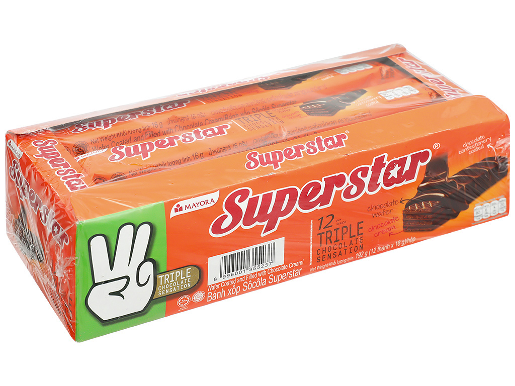 Với sản phẩm tươi sống, trọng lượng thực tế có thể chênh lệch khoảng 10%. Bánh Xốp Phủ Socola Superstar - Hộp 192g (12 thanh x 16g) Khối lượng: 192g NSX & HSD: in trên bao bì Hướng dẫn bảo quản: Nơi thoáng mát, tránh ánh nắng mặt trời Bánh xốp phủ socola Super Star là loại bánh được nhiều người yêu thích bởi sự giòn xốp kết hợp với lớp socola ngọt ngào, thơm ngon mang đến tay người dùng sản phẩm hấp dẫn, chất lượng. Bánh chứa nhiều giá trị dinh dưỡng tốt cho cơ thể, đảm bảo an toàn và cung cấp năng lượng để duy trì hoạt động suốt ngày dài Giá sản phẩm trên Tiki đã bao gồm thuế theo luật hiện hành. Bên cạnh đó, tuỳ vào loại sản phẩm, hình thức và địa chỉ giao hàng mà có thể phát sinh thêm chi phí khác như phí vận chuyển, phụ phí hàng cồng kềnh, thuế nhập khẩu (đối với đơn hàng giao từ nước ngoài có giá trị trên 1 triệu đồng).....