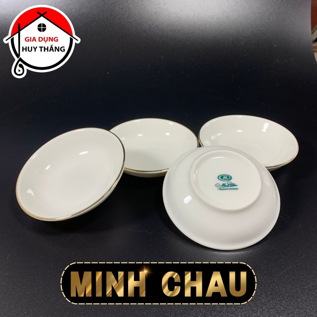 Bát chấm sứ trắng Minh Châu viền vàng thật 12K, Dĩa chấm sứ trắng trơn