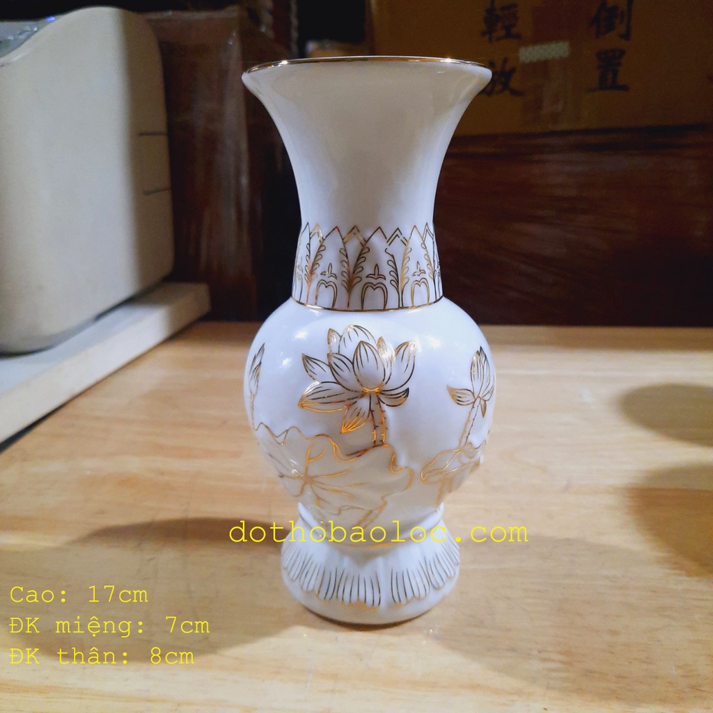 Chất liệu : Sứ 100 % Kích thước: Cao 17cm x ĐK thân: 8cm x ĐK miệng: 7cm Cao 19cm x ĐK thân: 9cm x ĐK miệng: 8,5cm Cao 22cm x ĐK thân: 11cm x ĐK miệng: 9,5cm Cao 25cm x ĐK thân: 12cm x ĐK miệng: 11cm Cao 30cm x ĐK thân: 14cm x ĐK miệng: 13cm Bình Bông là một vật không thể thiếu trên các bàn thờ , trang thờ , tủ thờ Dùng để chứa đụng hoa và nước nhằm phục vụ cho việc thờ cúng Dâng hoa lên tổ tiên , các bậc bề trên đã quá là quen thuộc với mọi người mọi nhà . Và là vật không thể thay thế được Bình bông làm tôn lên nét đẹp tâm linh cho các bàn thờ , trang thờ Chất liệu : Sứ 100 % Thiết kế tinh xảo , màu sắc hài hòa và độ bền vượt trội so với các sản phẩm ngang tầm giá . Màu sắc : Trắng có hoa sen xung quanh TẤT CẢ SẢN PHẨM ĐỀU DO SHOP TỰ CHỤP SHOP ĐỒ THỜ CÚNG LỘC PHÁT 0931 456 689 0979 456 689 0773 456 689 Website: dothobaoloc.com #dosu #đồ_sứ #Bạch_ngọc_sứ #bachngocsu #bạch_ngọc #gốm_sứ #dogom #đồ_gốm