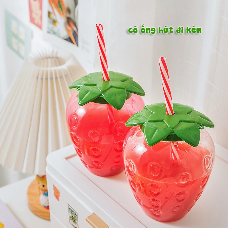 Bình Cốc Đựng Nước Hình Quả Dâu Tây Cute Dễ Thương Chịu Nhiệt Tốt Dung Tích 500ml Tặng Kèm Móc Hình Trái Dâu Và Ống Hút