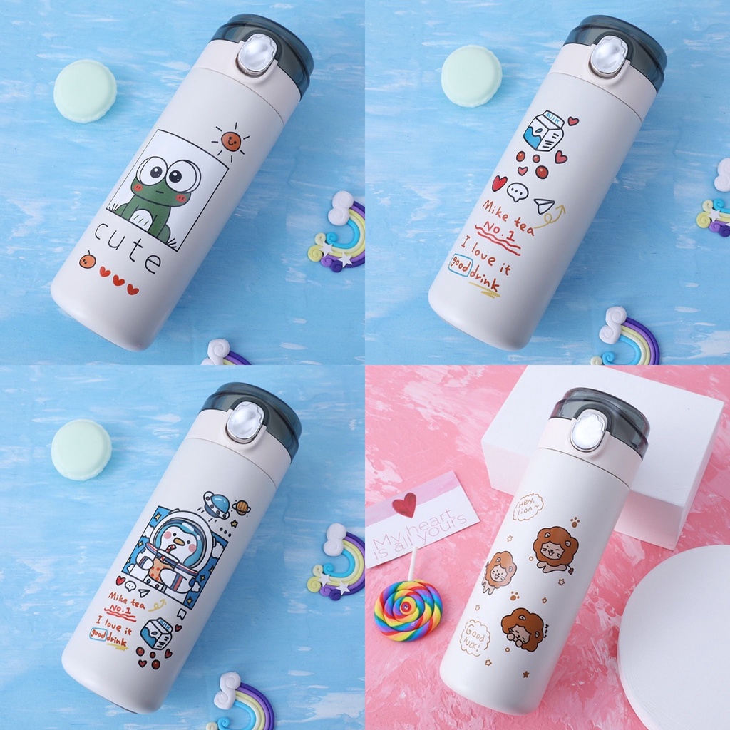 Bình giữ nhiệt Inox Trắng nắp cài Bình nước cute Hình thú Chim cánh cụt Trà sữa Baby Shark dễ thương 400ml