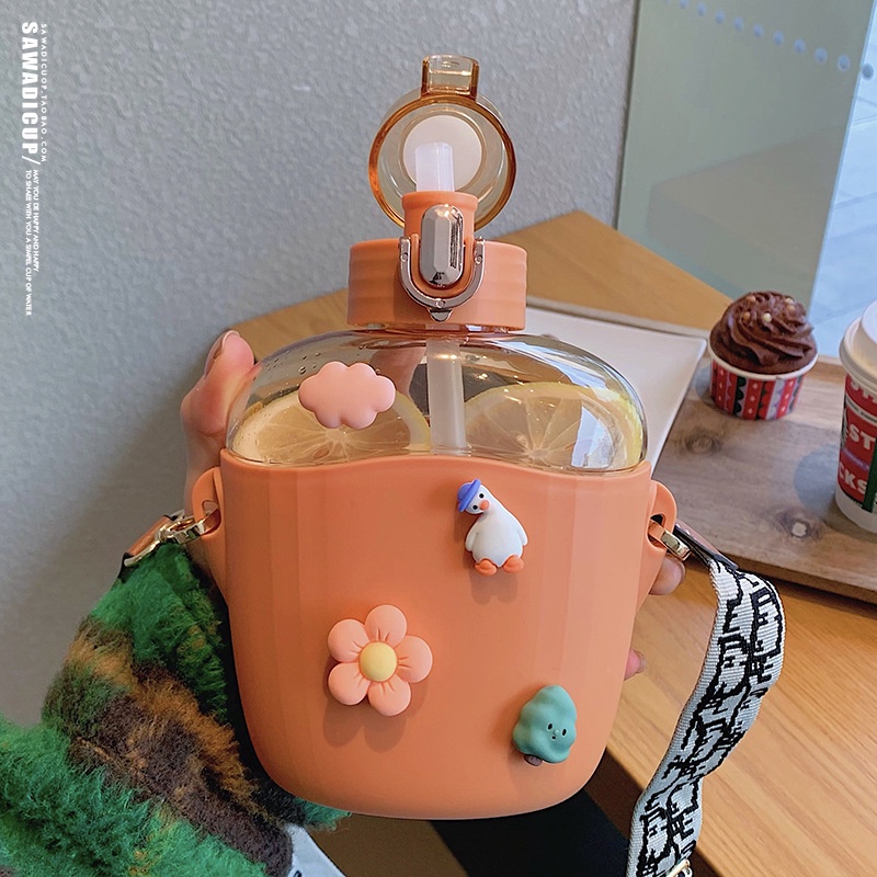 Bình nước cute, bình nước 700ml, tặng kèm dây đeo, ống hút, sticker