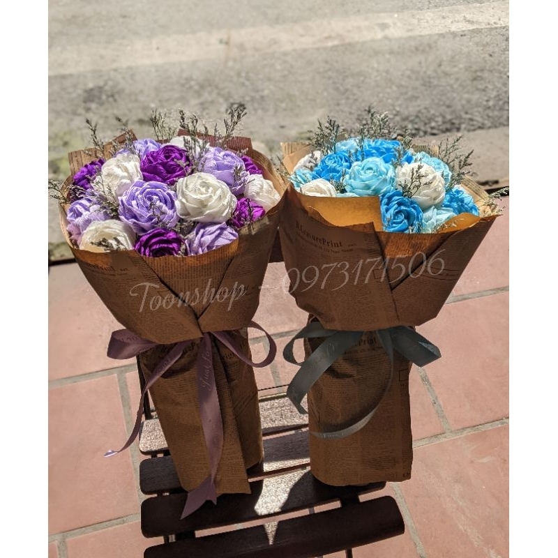 Hoa được làm từ chất liệu giấy nhún, còn gọi là hoa hồng xoắn. Sản phẩm làm thủ công hoàn toàn nên shop rất tỉ mỉ để cho ra được những bông hoa hồng tròn đều, cánh nét. Mình bó 11 bông kèm 1 chút sao khô. Bó hoa theo phong cách vinta