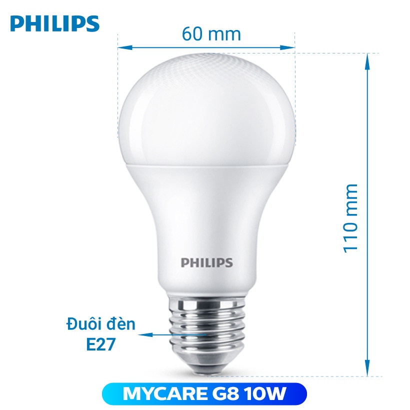 Bóng đèn LED Philips MyCare 10W 6500K E27 A60 - Ánh sáng trắng ƯU ĐIỂM NỔI BẬT BÓNG ĐÈN LED PHILIPS CHÍNH HÃNG + Tiết kiệm điện năng: Bóng đèn led Philips MyCare có công suất tiêu thụ điện chỉ 10W nhưng cho độ sáng tương đương bóng đèn dây tóc 83W, tiết kiệm điện nă