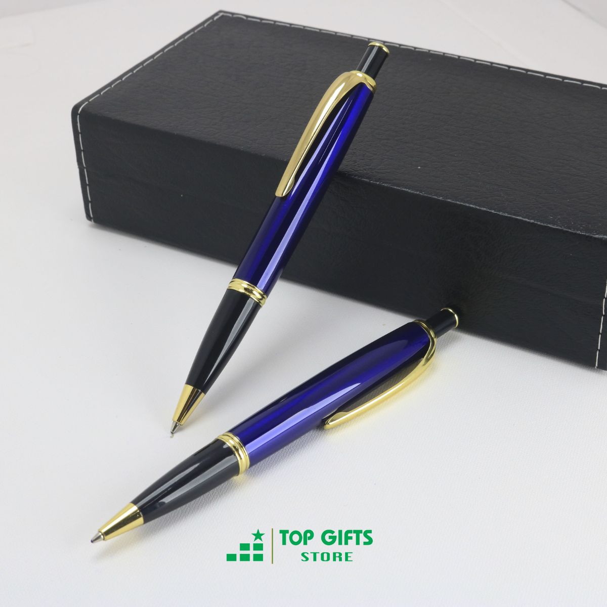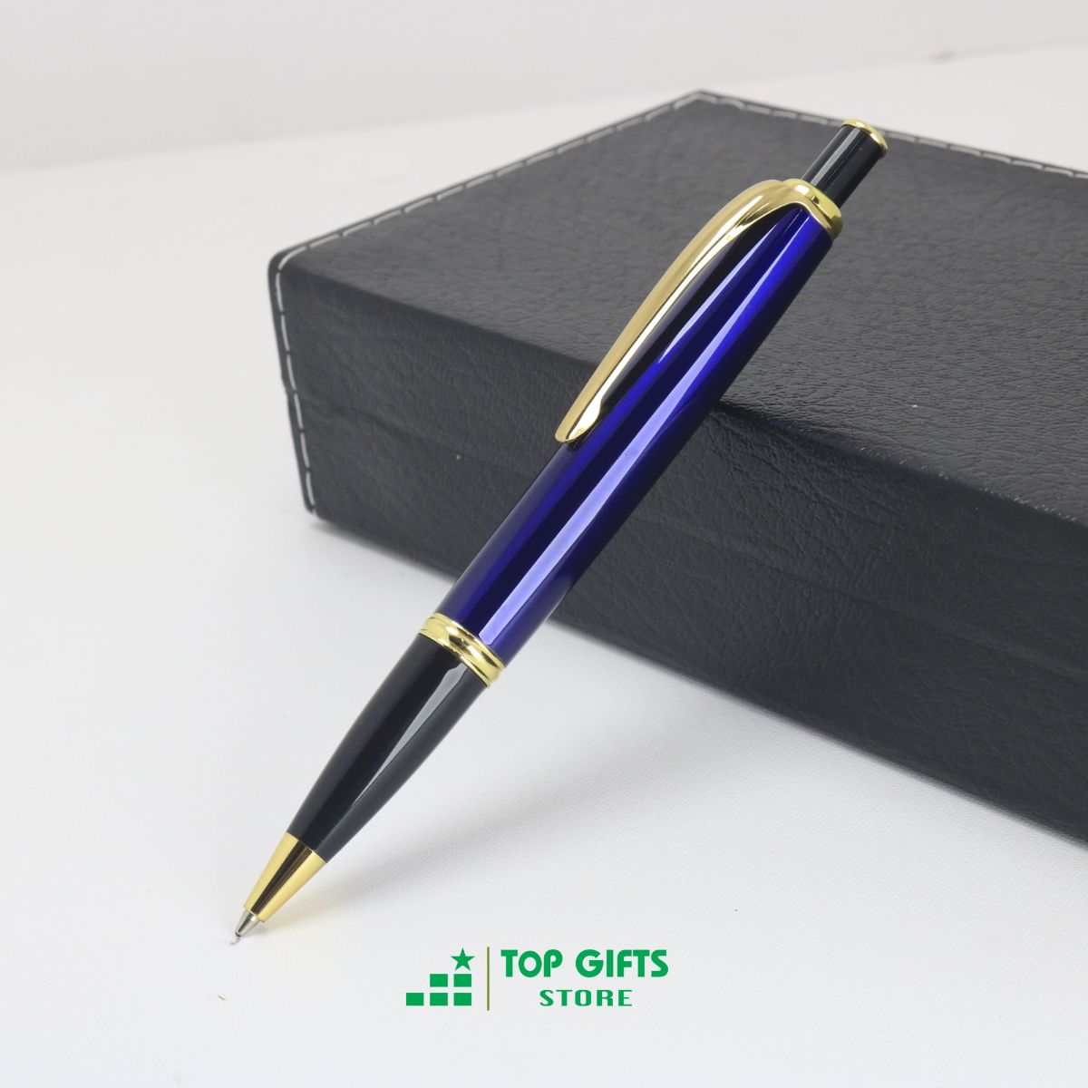 Bút ký bấm xanh dương viền vàng BB001 khắc tên - Ngòi 0.7mm mực xanh + Hộp bút