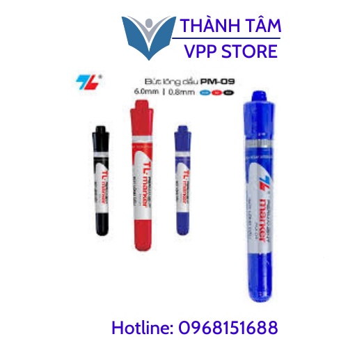 Thông số kĩ thuật : Tên danh mục Bút lông dầu Thương hiệu Thiên Long Bề rộng nét viết 0.8mm & 6mm Số đầu bút 2 Đóng gói 10 cây / hộp Trọng lượng 24 gram Màu mực Xanh/Đỏ/Đen Bút lông dầu Thiên Long PM-09 là sản phẩm mới thuộc nhóm dụng cụ văn phòng, do Tập đoàn Thiên