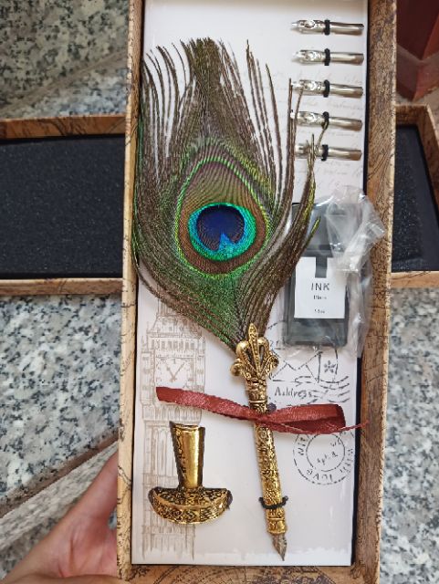 Set quản gồm 1 quản lông vũ 1 đế cắm bút 5 ngòi ko gỉ 1 mực đen Set 140k Lưu ý: nếu khách muốn viết ngòi nhọn có thể tham khảo thêm các sp như ngòi G nhật, hunt, gillot. Các ngòi đều gắn được quản lông vũ trên
