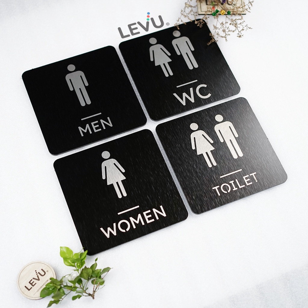 Bảng nhôm alu cao cấp dán tường WC - Toilet - Restroom - Men - Women khắc laser siêu nét có thiết kế kết hợp giữa các nội dung trang trí dán cửa khu vực phòng vệ sinh tùy chọn theo mẫu, bảng khắc laser kỹ thuật cao trên nền nhôm aluminium xước đen cao cấp sáng tạo man