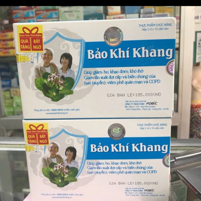 Bảo Khí Khang là thực phẩm chức năng giúp tăng cường sức khỏe hệ hô hấp phòng ngừa và hỗ trợ điều trị bệnh viêm phế quản mạn, hen (suyễn), phổi tắc nghẽn mạn tính - COPD 1. Thành phần của Bảo Khí khang: • Cao AntidiCOPD (Sophora flavescens, Dracaena cambodiana):..................................350mg • Cao Cốt khí củ:..............................................................................................................150mg • L-Carnitine fumarate:.....................................................................................................100mg • Cao Lá Hen: ...................................................................................................................50mg • Acid alpha Lipoic...................:.........................................................................................25mg • Magiê:.............................................................................................................................16mg 2. Tác dụng của Bảo Khí Khang: • Tăng cường sức khỏe đường hô hấp • Phòng ngừa và hỗ trợ điều trị bệnh viêm phế quản mạn, hen (suyễn), phổi tắc nghẽn mạn tính - COPD • Giúp giảm tần suất của đợt cấp và biến chứng của viêm phế quản mạn, hen (suyễn) COPD, phổi tắc nghẽn mạn tính - COPD • Giúp dễ thở hơn ở người có bệnh đường hô hấp • Giúp giảm: Ho, khạc đờm, khó thở 3. Người nên sử dụng Bảo Khí Khang: • Người bị 1:2 hoặc cả 3 triệu chứng: ho, khạc đờm, khó thở • Người bị hen (suyễn), viêm phế quản mạn tính, phổi tắc nghẽn mạn tính - COPD; tâm phế mạn; khí phế thũng; lao phổi và ung thư phổi • Người có nguy cơ mắc các bệnh hô hấp mạn tính: hút thuốc, làm việc trong môi trường độc hại, khói, bụi • Các trường hợp khó thở do mắc các bệnh đường hô hấp khác: viêm phổi, viêm phế quản co thắt 4. Cách dùng Bảo Khí Khang: • Uống ngày 2 lần, mỗi lần 2-3 viên • Nên sử dụng sản phẩm trước bữa ăn 30 phút cùng nước ấm • Nên sử dụng liên tục một đợt từ 3-6 tháng để có kết quả tốt nhất • Sản phẩm có thể sử dụng lâu dài, có thể sử dụng cùng thuốc tây • Thời gian hiệu quả tùy theo cơ địa người bệnh *Lưu ý: - Sản phẩm không phải là thuốc và không có chức năng thay thế thuốc chữa bệnh - Tác dụng của sản phẩm tùy thuộc vào sự hấp thu của từng người