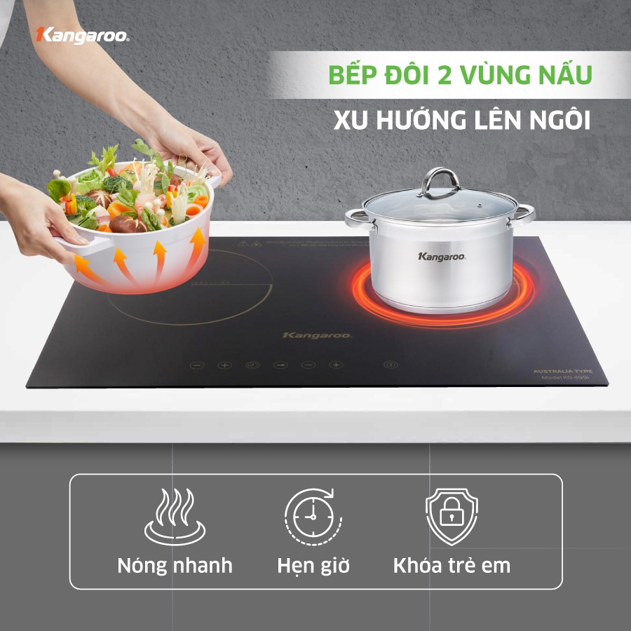 TÍNH NĂNG SẢN PHẨM Bếp đôi điện từ hồng ngoại Kangaroo KG499N với Mặt bếp điện bằng kính cường lực siên bền, chống xước, chịu được nhiệt độ lớn, tránh cho bề mặt bếp bị biến dạng hoặc nóng chảy. Chất liệu kính sáng bóng dễ dàng làm sạch. Bên điện từ có cảnh báo “E0” –