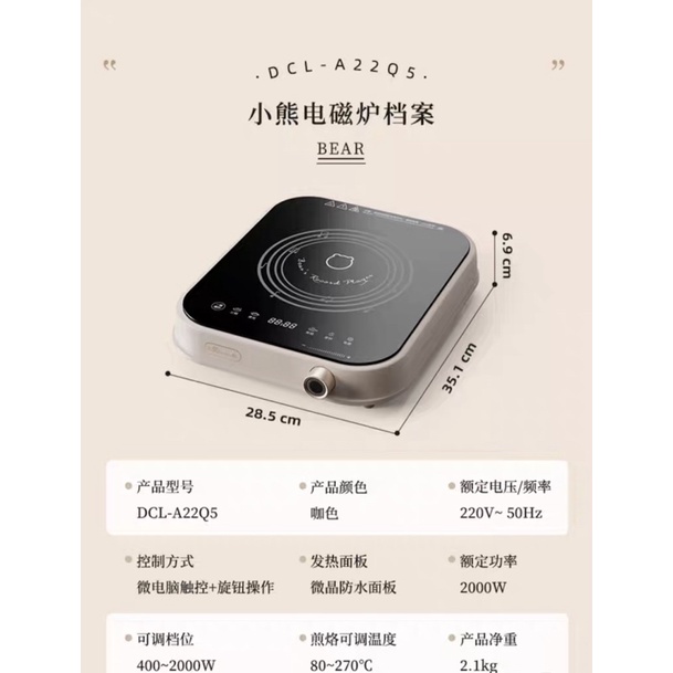🖤BẾP TỪ ĐƠN BEAR DCL-A22Q5 -------------------------- ◼️Model: DCL-A22Q5 ◼️Thương hiệu: BEAR ◼️Xuất xứ: Nội địa trung ◼️Hàng chính hãng 💯% ◼️Bảo hành 6 tháng ◼️Điện áp: 220V ◼️Tần số: 50Hz ◼️Công suất: 2000W ◼️Trọng lượng: 2.1kg ◼️Màu sắc: Xanh,trắng ◼️Kích thước: 28,5 cmx35,1 cmx6,9cm 🕶TÍNH NĂNG SẢN PHẨM🕶 ✔️Công suất lớn 2000W - nóng siêu nhanh, ăn lẩu, nấu nướng rất tiện lợi nhờ công nghệ nấu nhanh, giữ tươi ngon của thực phẩm khi chế biến. ✔Sợi đồng nhiệt tầng đôi 150mm, làm nóng bề mặt nhanh chóng và đồng đều 360 độ nhờ mật độ dày đặc hình tròn. ✔️9 cấp độ nhiệt - đa dạng trong chế biến các món ăn, từ nấu các món xào, rán, chiên, ninh, hầm hay ăn lẩu... ✔Cảm ứng từ tính thông minh, tự ngắt khi nhấc nồi và đặc biệt không bị nóng khi nhấc nồi ra khỏi bếp, giúp an toàn cực cao trong nấu nướng, không gây bỏng hay tổn thương khi sờ vào. ✔Sử dụng đơn giản vì thiết kế 1 núm xoay lựa chọn cấp độ, bật tắt chỉ cần nhấn 1 nút. Không giới hạn về độ tuổi sử dụng. ✔Chống quá nhiệt, tự ngắt khi nấu nướng, giúp việc sử dụng yên tâm hơn, không gây cháy nổ nhờ chip cảm ứng thông minh tích hợp bên trọng ✔Vệ sinh dễ dàng trên bề mặt khi nấu nướng xong nhờ tính năng không thấm nước. ✔Thiết kệ nhỏ gọn, lưu trữ dễ dàng vào tủ khi không dùng đến. ✔Phù hợp với đa dạng các loại nồi phổ biến : Nồi bếp từ, nồi inox, nồi sắt, nồi thép. ✔Đế bếp từ Bear DCL-A22Q5 được thiết kế siêu an toàn nhờ hệ thống làm mát nhanh, tản nhiệt trong tíc tắc. ✔Chân chống trơn trượt khi sử dụng bếp được tích hợp, giúp chế biến rất tiện lợi