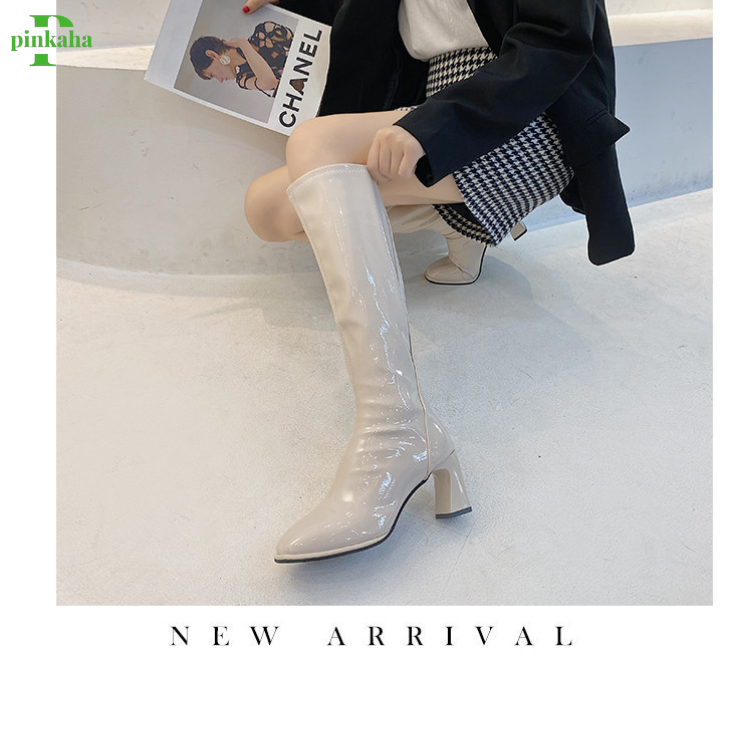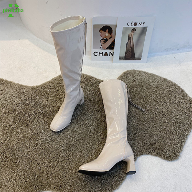 Bốt Đùi Nữ Cao Cổ Da Trơn Bóng Kéo Khóa Sau Đế Vuông Chất Đẹp Thời Trang