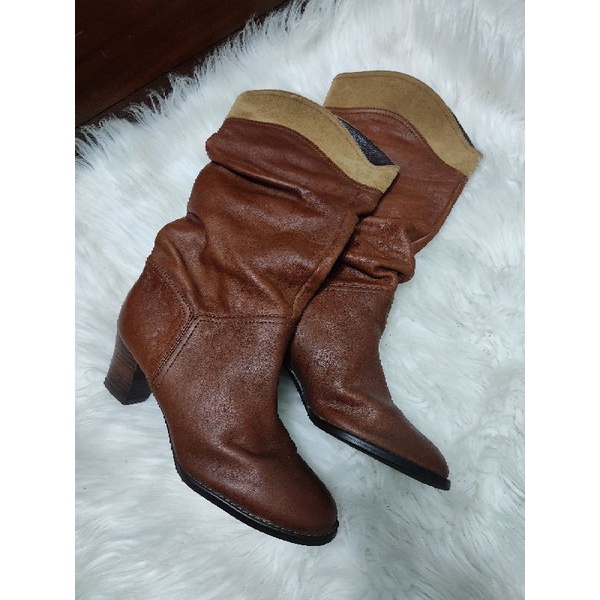 Bốt lửng Size 36 Gót cao 5,5cm Ống cao 26,5cm Chất liệu: da bò Bên trong lót vải đẹp. Màu nâu đậm. Phần nâu nhạt là chất da lộn. Giá bán: 330k