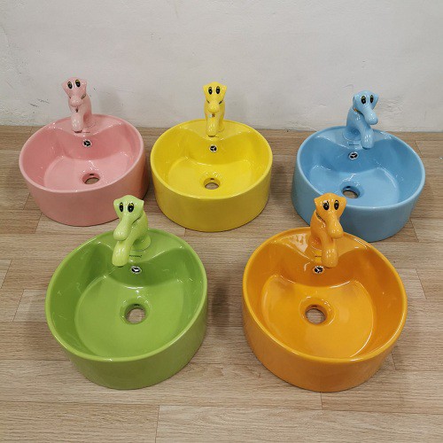 Chậu lavabo trẻ em đặt bàn sứ nung màu - Chậu bao gồm xiphong nhựa chưa bao gồm vòi - Gồm các màu: xanh lá, xanh dương, hồng, cam, vàng, trắng - Màu chậu nung nên bền theo thời gian, không bong tróc như hàng màu phun sau khi đã nung sứ - Bảo hành 05 năm Đặt hàng công