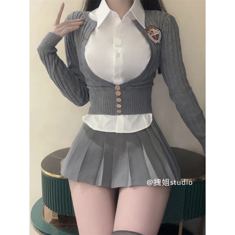 Bộ Áo Cardigan Dệt Kim Dáng Ôm + Chân Váy Xếp Ly Phong Cách Hàn Quốc Thời Trang Xinh Xắn Cho Nữ
