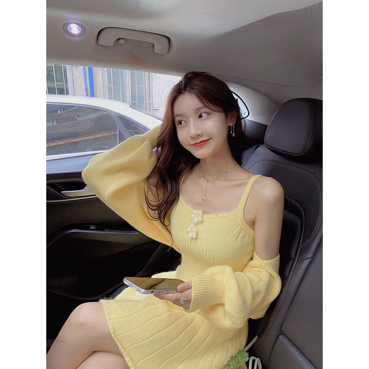 Bộ Đầm Dệt Kim Hai Dây + Áo Khoác Cardigan Xinh Xắn Thời Trang 2023