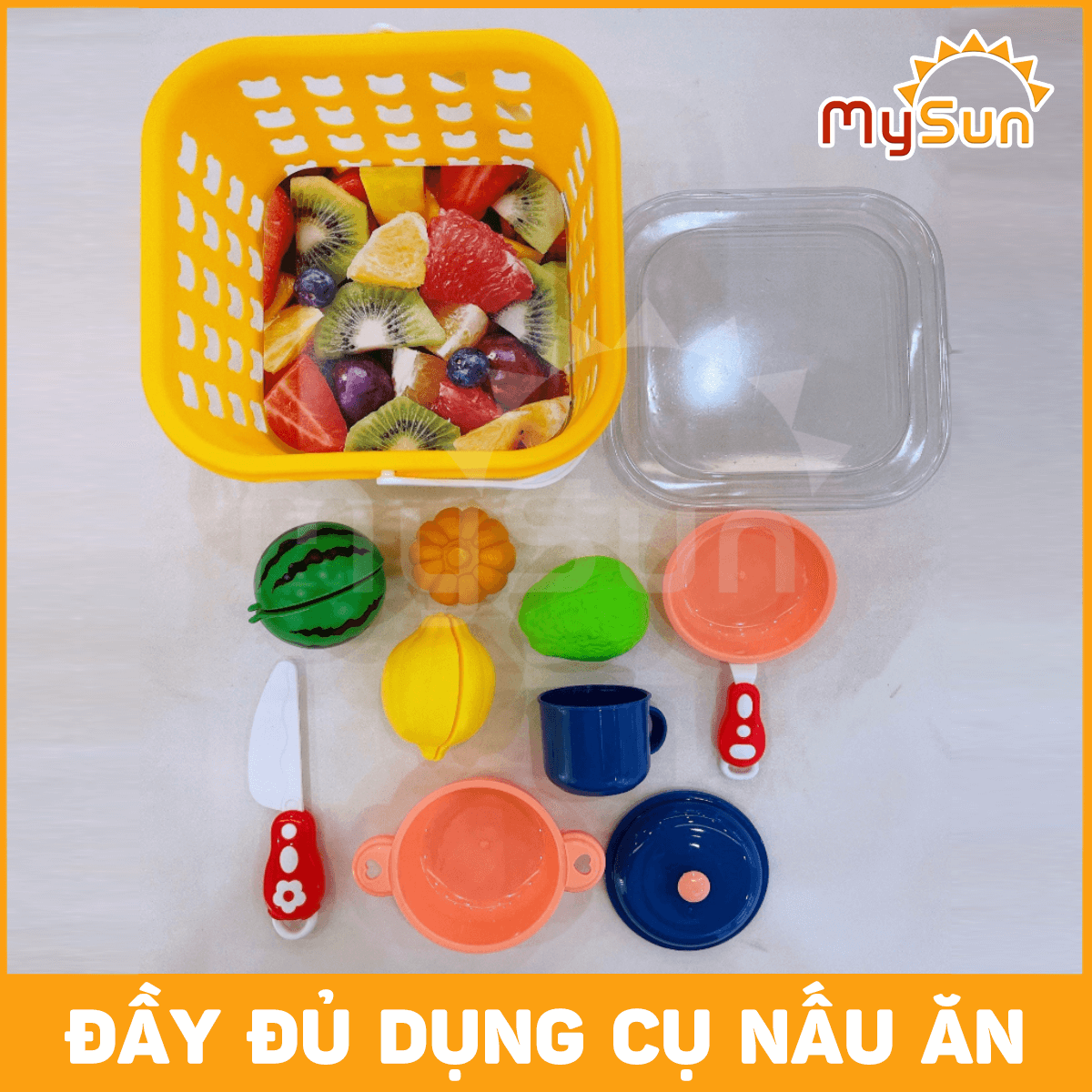 Gồm: 4 củ quả, 1 dao, 1 cốc, 1 nồi, 1 chảo, 1 giỏ. Kích thước giỏ: 18.5cm x 14cm x 18.5cm