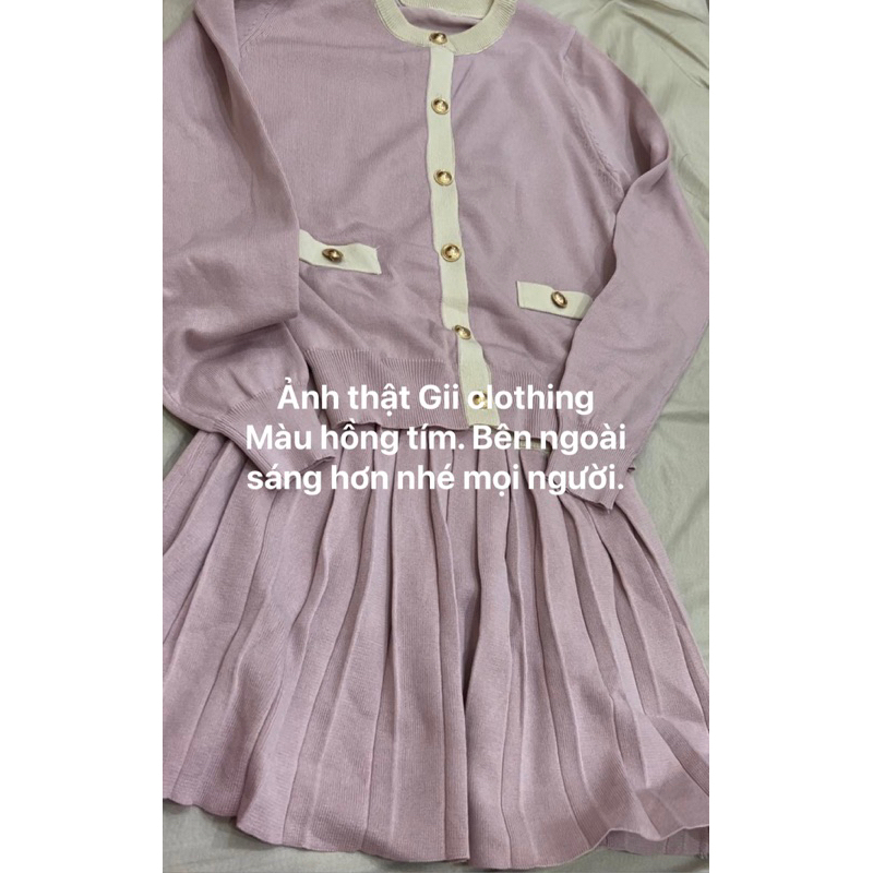 Bộ đồ len dệt kim áo cổ tròn dài tay hai túi cúc tròn mạ vàng chân váy ngắn xếp ly váy thu đông nữ