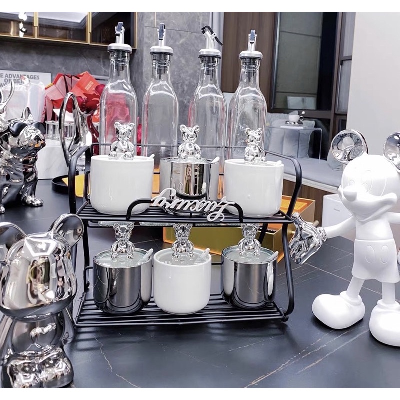 Bộ Đựng Gia Vị Luxury Hũ Gấu Màu Bạc, Trắng Khung Đen Sành Điệu