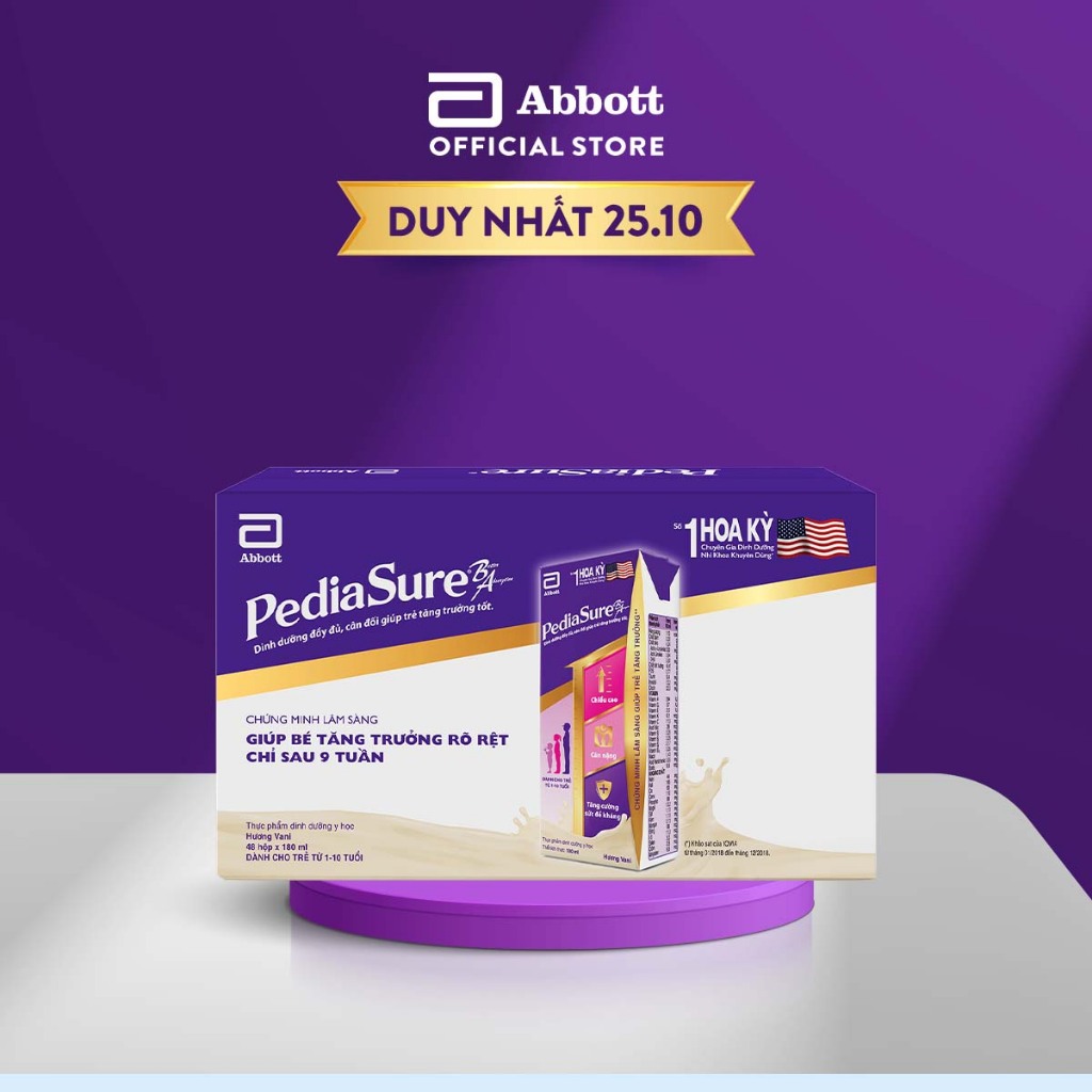 PediaSure với nguồn dinh dưỡng đầy đủ và cân bằng với 37 dưỡng chất thiết yếu giúp bé tăng trưởng rõ rệt chỉ sau 9 tuần: Chiều cao, cân nặng và sức đề kháng. PediaSure có chứa: - 3 nguồn đạm, canxi và Vitamin D giúp cân bằng và duy trì liên tục axit amin thiết yếu để phát triển cơ và xương. - Arginin gia tăng số lượng và hoàn thiện các tế bào ở đĩa sụn giúp xương phát triển. - Vitamin K2 tự nhiên giúp tăng cường vận chuyển canxi giúp tăng khối lượng và cho xương chắc khỏe. - Prebiotic, probiotic và selenium và kẽm giúp hấp thụ và tăng cường sức đề kháng tốt hơn. Đối tượng sử dụng: trẻ biếng ăn từ 1-10 tuổi. Cách pha 1 ly PediaSure chuẩn: Cho 190ml nước chín nguội vào ly, vừa từ từ cho vào 5 muỗng gạt ngang vừa khuấy đều cho đến khi bột tan hết. Bảo quản: Bảo quản hộp chưa mở ở nhiệt độ phòng. Hộp đã mở phải được đậy kín và bảo quản ở nơi khô mát (nhưng không cho vào tủ lạnh) và sử dụng trong vòng 3 tuần. PediaSure vừa pha phải được dùng ngay hay đậy kín, cho vào tủ lạnh và dùng trong vòng 24 giờ. Lưu ý: - Không dùng cho trẻ bị bệnh Galactosemia. - Không dùng cho trẻ dưới 1 tuổi, trừ khi được bác sĩ chỉ định. - Tham khảo bác sĩ/chuyên viên dinh dưỡng về nhu cầu dinh dưỡng cụ thể của con bạn - Không dùng nuôi ăn qua đường tĩnh mạch. Hạn sử dụng: 24 tháng kể từ ngày sản xuất. Sản xuất tại Singapore. Nhập khẩu và phân phối: Công ty TNHH DINH DƯỠNG 3A (Việt Nam)
