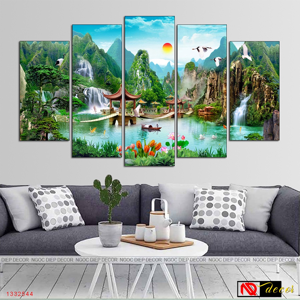 Bộ 5 tấm tranh dán tường phong thủy - Tranh dán tường phòng khách, kèm băng dính xốp