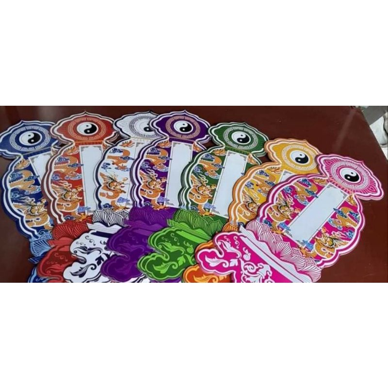 Hình tượng bài vị: Pháp luân. Gồm 7 màu: Đỏ, xanh lam, xanh lục, đỏ, vàng, trắng, hồng, tím. Chất liêu: Giấy bìa cứng, xốp fomex. Kích thước: 18*40 cm.