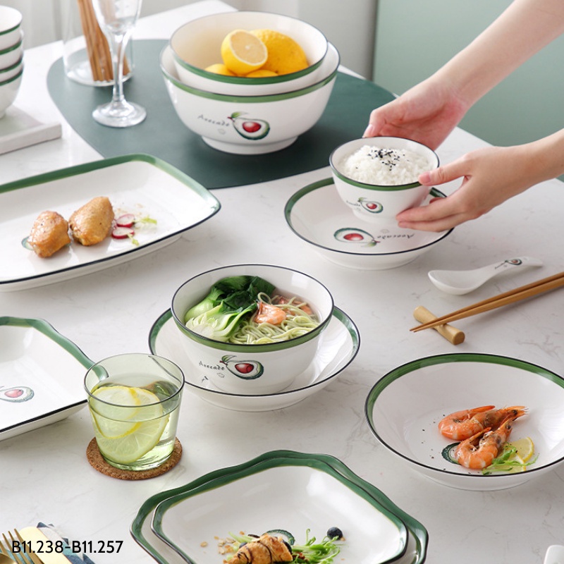 Bộ bát đĩa quả bơ , bộ chén dĩa sứ viền xanh Alifis