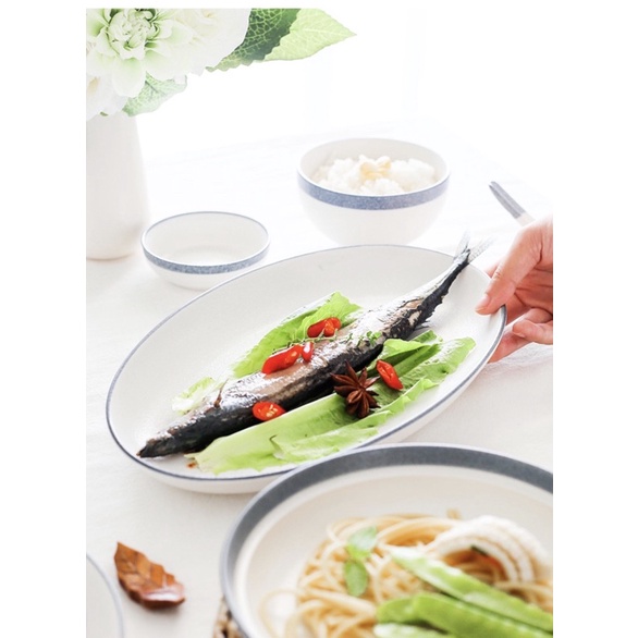 Bộ bát đĩa trắng xanh ghi men bông tuyết - phong cách Hàn Quốc
