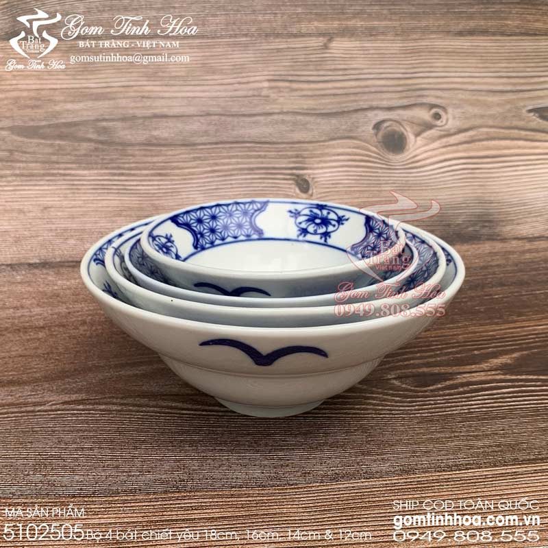 Bộ bát chiết yêu hoa chanh gốm sứ Bát Tràng cao cấp. Bát sứ đẹp, chất liệu men trắng, họa tiết hoa chanh màu xanh lam sắc nét. Bộ bát gồm 4 sản phẩm với 4 loại đường kính khác nhau: - Đường kính 18cm - Đường kính 16cm - Đường kính 14cm - Đường kính 12cm Kích thước