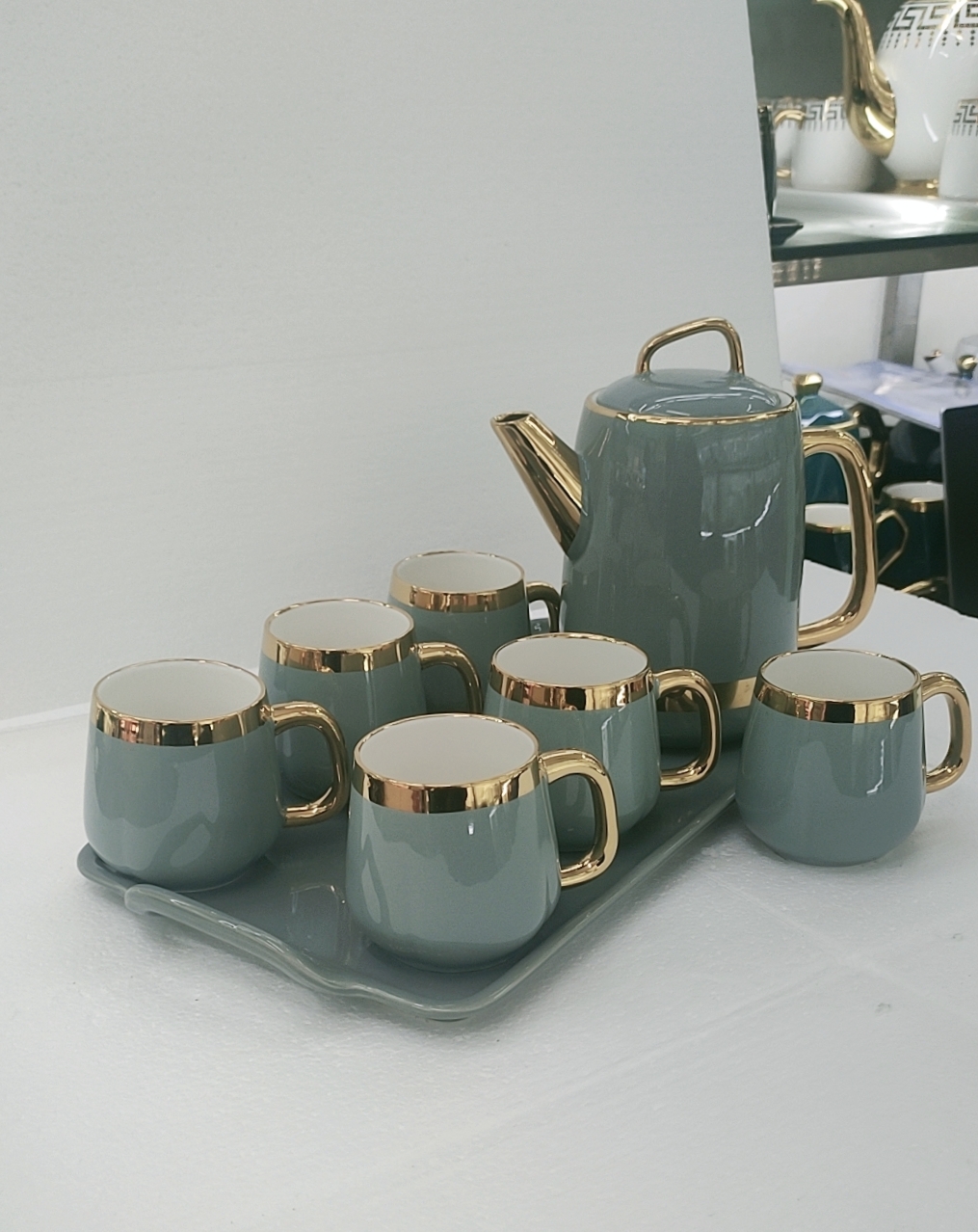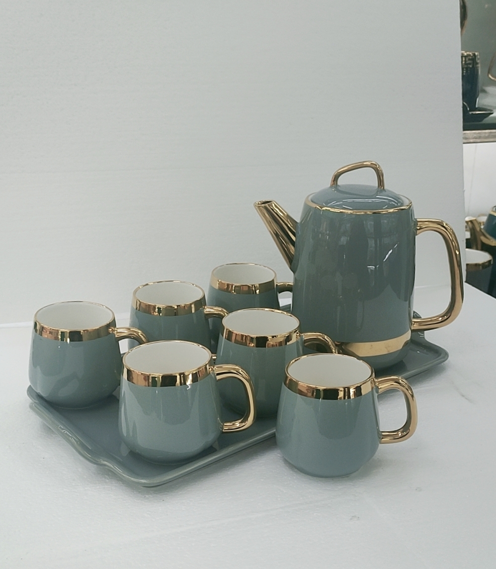 Bộ bình trà  kèm khay pha trà, cà phê viền vàng cao cấp mẫu mới