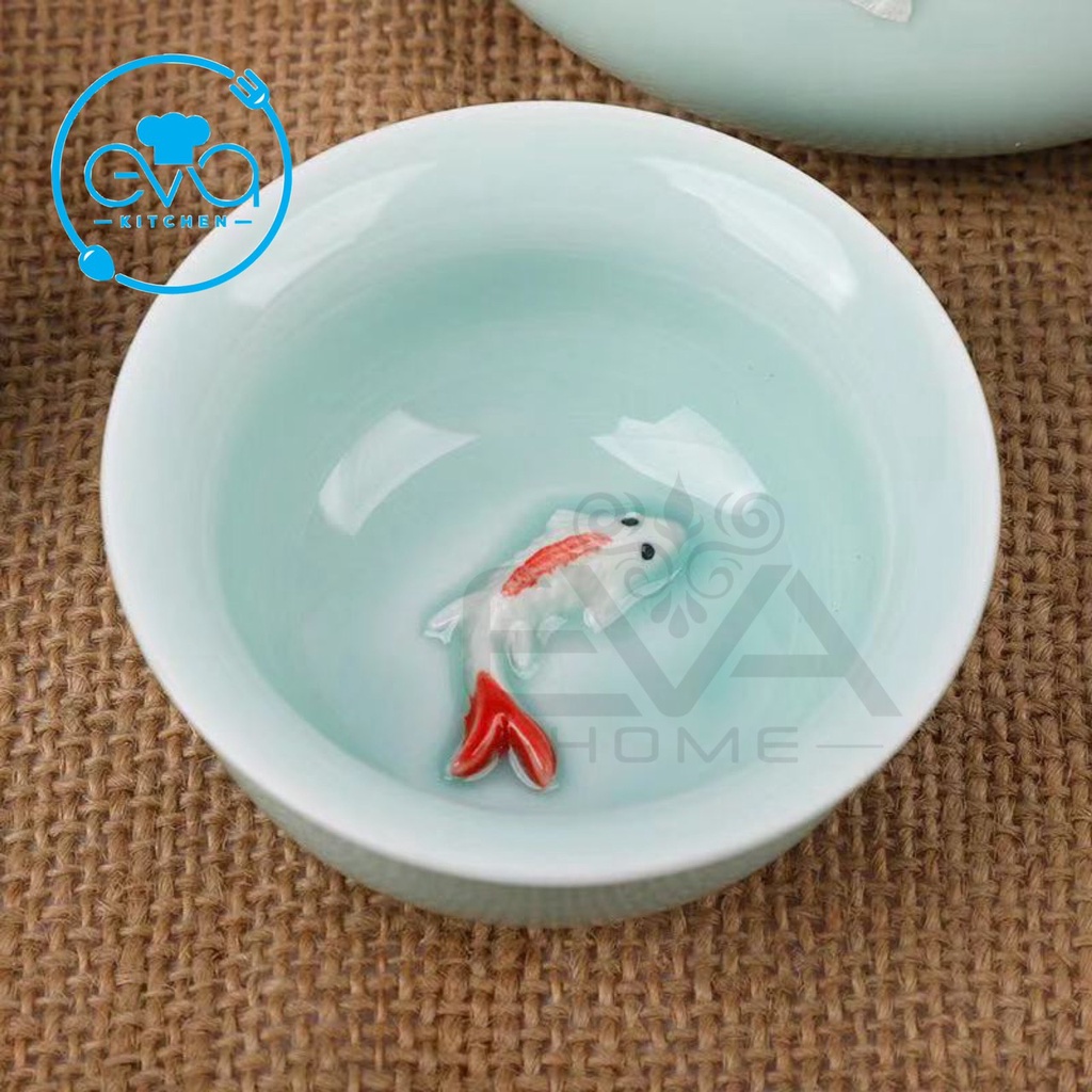 Bộ Bình Trà Men Ngọc Nhạt Gồm Ấm Và 6 Chén Trà Có Hình Cá 3D Sang Trọng