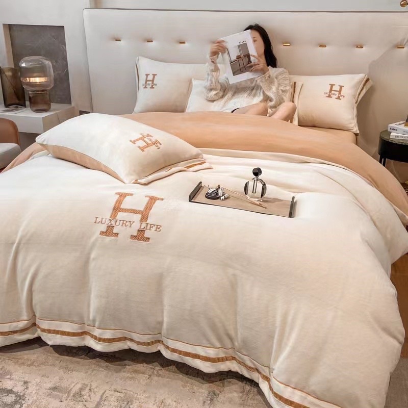 Bộ chăn ga gối Nỉ nhung mịn thêu chữ H chăn có viền SHOP CHIÊU CAO SU