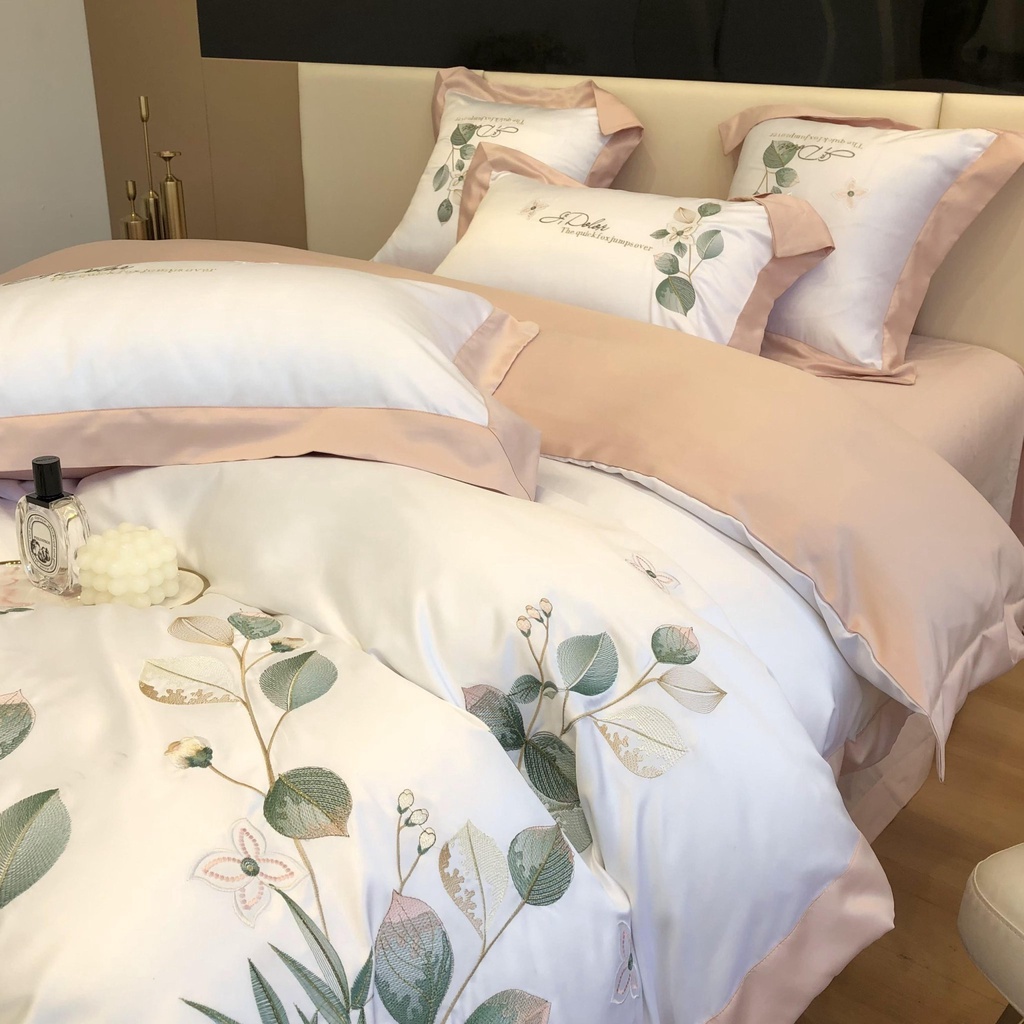 Bộ chăn ga lụa 60s thêu lá nhẹ nhàng, thoáng mát thích hợp 4 mùa