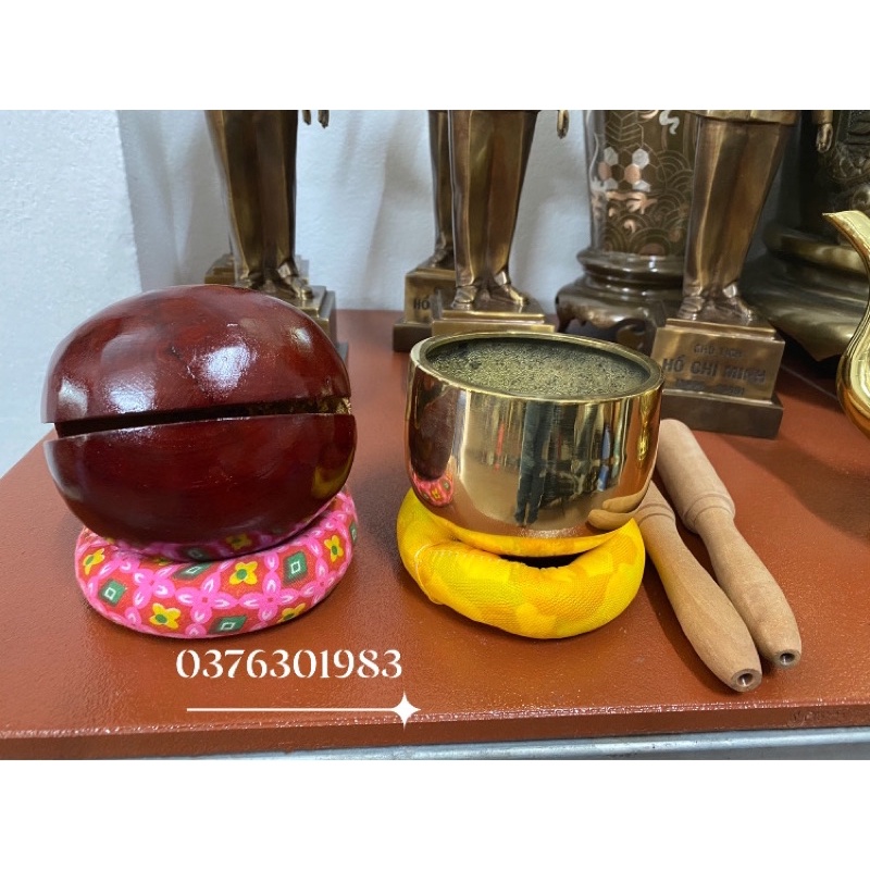 ✔Chuông đồng, mõ gỗ ✔Bộ sản phẩm gồm: 1 chuông đường kính 11cm cao 8cm+ 1 đế vải để chuông + 1 tay đánh chuông, 1 mõ + 1 đế vải để mõ + 1 tay mõ ✔Âm thanh vang, không chói. ✔Trong khi tụng niệm, tiếng mõ có tác dụng duy trì sự nhịp nhàng đều đặn, không lộn xộn đ