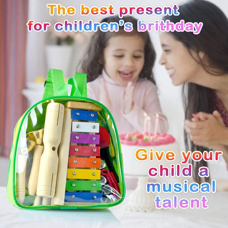 Accurate tuned instrument with variety of beautiful sound, the vivid color code for each tone makes it easy for kids to learn the tunes and rhythm; covered the smooth surface coating, make it safe and friendly for the kids to play around, the portable carry bag easily holds all the toy instruments for management and take them on the go; Suits for musical education for toddlers and preschool kids to get the early inspiration and discover the joy from music and melody, helps them to study the initial musical concept during play with musical toys; Perfect and creative gift for toddlers and kids on Birthday or Christmas holiday from parents and grand parents, playing along with the kids also helps to create opportunities to interact with kids and create memory of happiness; MUSICAL TOY SET FOR JOY Play and Learn Together Musical instruments for toddler and children is very suitable for musical teaching in classroom as well as the family members to play together with your kids; colour: Random color, don't accept the specified color. Material: Wooden + metal Package Contents: 2* transparent dance board 1* tambourine 2* rhythm bar 1* double ring 2* small Touch-clock * 2 iron finger cymbals 2* sand egg 2* Xiaosha Hammer 1* color barbell 1* Triangle-Iron 2* wrist bell 1* octave aluminum piano 1* transparent backpack Please Note: 1. When playing, please be accompanied by adults. It will be much safe to avoid kids using Claves or Mallets, strikers to hurt themselves in eyes or face. 2. Kids can play it by clapping with hands. Please not use other strikers, which may break the tambourine.Only the above package content, other products are not included. Note: Light shooting and different displays may cause the color of the item in the picture a little different from the real thing. The measurement allowed error is +/- 1-3cm.