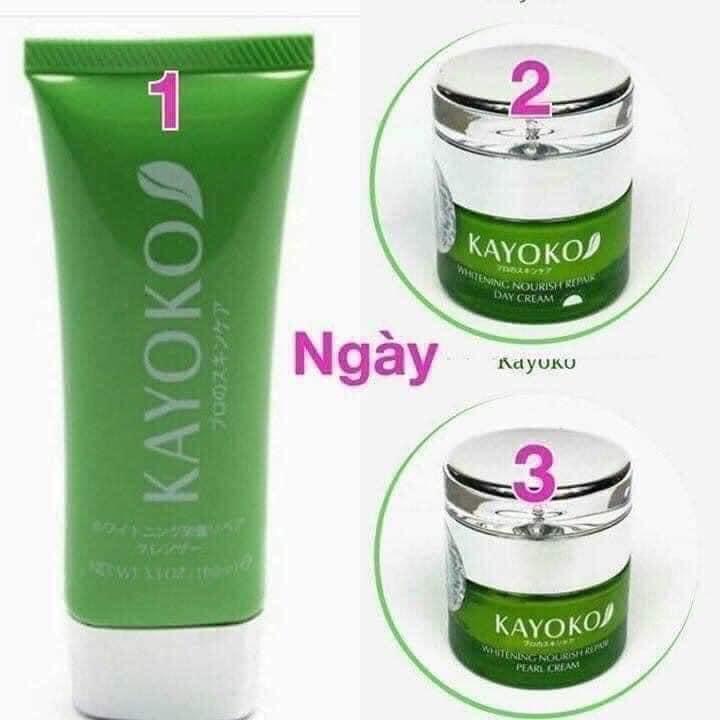 Bộ Kem Kayoko Xanh 5 Món Trắng Da Mờ Nám Nhật Bản - Xuất xứ: Nhật Bản - Thương hiệu: Kayoko Kayoko xanh 5 món 1. Sữa Rửa Mặt Làm Trắng Chống Tàn Nhang 2. Kem Dưỡng Trắng Hồng, Chống Nắng (Pearl Cream) 3. Kem Dưỡng Trắng Da Tinh Khiết Ban Ngày (Day Cream) 4. Kem Là