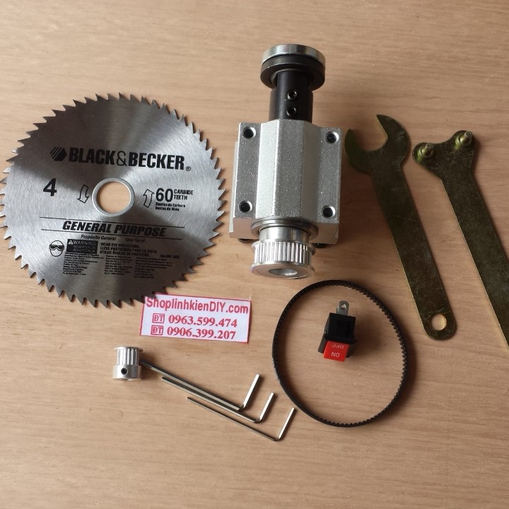 bộ kít sử dụng 2 bạc đạn NSK - Japan lỗ trục 12mm và thanh trục trơn 12mm đảm bảo độ cứng chắc , trơn tru linh kiện lắp ráp được tính toán chính xác đảm bảo không ma sát với bạc đạn gây nóng khi máy hoạt động Bộ pulley truyền động tỷ lệ 2.7 / 1 tăng mạnh lực xoắn cho động cơ Lưỡi Cưa 4 inch 6 răng KM : công tắc , khóa mở và lục giác Chất Liệu : Nhôm Đúc Nguyên Chất