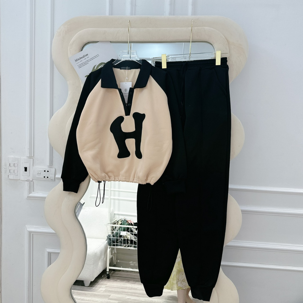 BỘ NỈ ÁO CỔ BẺ CHỮ H DÀI TAY 2 MÀU CHO NỮ