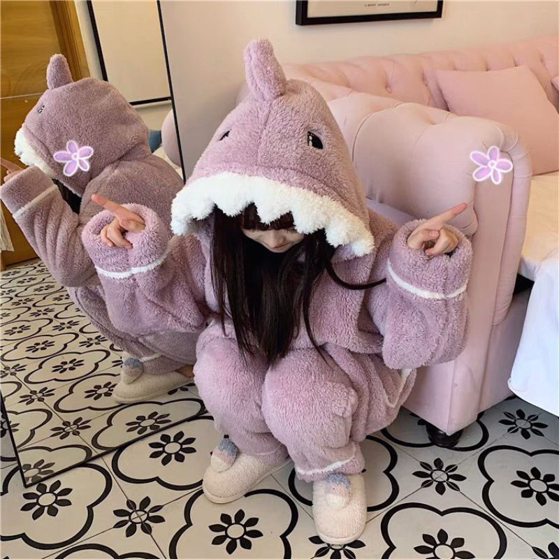 Bộ ngủ lông CÁ MẬP TÍM, bộ mặc nhà pijama quần áo ngủ dài tay thu đông xuân