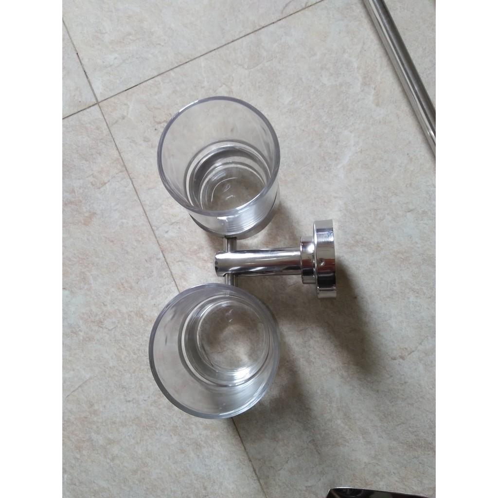 Bộ phụ kiện nhà tắm cao cấp SXinno chất liệu inox bộ phụ kiện gồm : bàn kính có lan can khay đựng xà bông khay đựng cốc và 2 cốc đánh răng giàn khăn đôi lô giấy vệ sin...