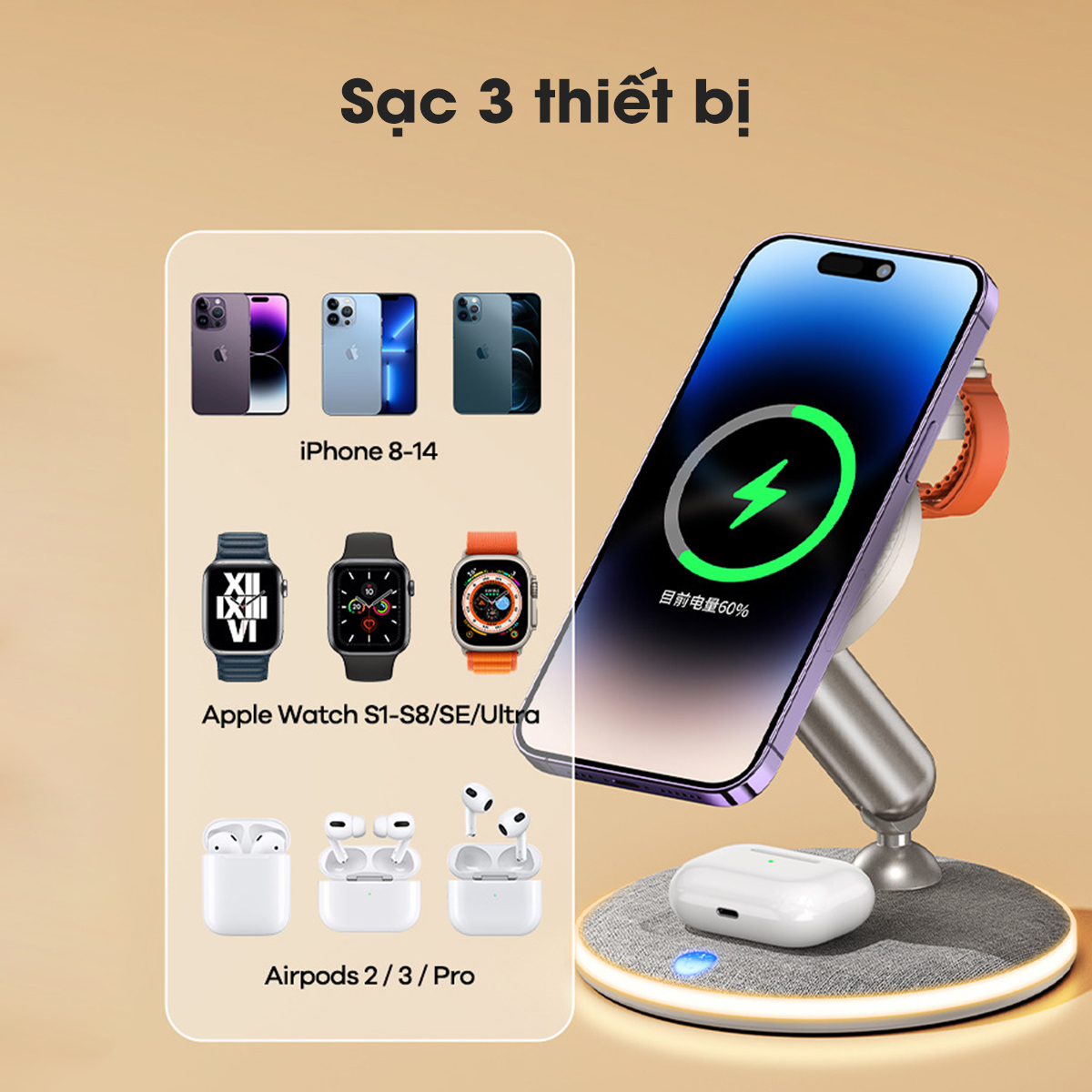 Giới thiệu sản phẩm Bộ sạc không dây 3in1 Remax RP-W90 là một bộ sạc tiện ích dành cho các thiết bị di động của bạn. Sản phẩm có thiết kế đẹp mắt với khả năng gấp gọn cùng nhiều tính năng tiện ích giúp bạn sạc đồng thời 3 thiết bị cùng một lúc, bao gồm một smartphone, một tai nghe TWS và một smartwatch hỗ trợ sạc không dây. Thiết kế hiện đại, dễ dàng gấp gọn Thiết kế của 3in1 RP-W90 rất hiện đại và sang trọng. Sản phẩm được thiết kế như một chiếc giá đỡ điện thoại với mặt đỡ nam châm từ tính. Màu sắc trang nhã và tinh tế cùng với kích thước nhỏ gọn giúp sản phẩm phù hợp với bất kỳ không gian nào, từ bàn làm việc, bàn đầu giường cho đến phòng khách hay văn phòng làm việc. Đặc biệt, sản phẩm có thể gấp gọn giúp người dùng dễ dàng lưu trữ và mang theo. Kích thước sản phẩm trước khi gấp: 118 x 128.69mm Kích thước sản phẩm sau khi gấp: 118 x 70.35mm Sạc cho 3 thiết bị cùng lúc Giống như tên gọi, Đế sạc 3in1 này được thiết kế với 3 khu vực sạc, cho phép bạn đồng thời nạp năng lượng cho 3 thiết bị khác nhau. Đế sạc không dây 3in1 tương thích với nhiều thiết bị di động hỗ trợ sạc không dây theo tiêu chuẩn Qi, Nó cũng tương thích với tai nghe không dây và đồng hồ thông minh sử dụng công nghệ sạc không dây. Với công nghệ sạc không dây tiên tiến, đế sạc Remax RP-W90 cho phép bạn sạc các thiết bị chỉ bằng việc đặt chúng lên trên đế sạc mà không cần sử dụng dây cáp. Điều này giúp bạn tiết kiệm thời gian và giữ cho không gian xung quanh bạn gọn gàng hơn. Sản phẩm sử dụng lõi dây đồng nguyên chất với khả năng dẫn điện cực tốt. Vòng nam châm xung quanh lõi đồng của mặt sạc điện thoại có lực từ siêu mạnh, hút dính chắc chắn đảm bảo giữ chắc chắn các thiết bị, chống rơi. Mặt sạc 15W có thể sạc được cho smartphone mang ốp. Chúng có thể phát hiện sạc không dây trong khoảng cách 6mm. Công suất lớn 22W, tương thích với nhiều thiết bị Khác với các đế sạc không dây thông thường, Remax RP-W90 có tổng công suất 22W Max, hỗ trợ công nghệ sạc nhanh không dây 15W Max dành cho các smartphone. Vì vậy, smartphone của bạn sẽ được đẩy nhanh tiến độ sạc mà vẫn đảm bảo an toàn. Công suất Điện thoại: 5W/7.5W/10W/15W (Max) Công suất Đồng hồ: 2W (Max) Công suất Tai nghe: 5W (Max) Nhằm đảm bảo an toàn trong quá trình sử dụng, nhà sản xuất nó còn tích hợp các tính năng bảo vệ, như quá nhiệt, quá áp và ngắn mạch, để đảm bảo an toàn tuyệt đối cho thiết bị của bạn trong quá trình sạc. Chức năng đèn ngủ tiện lợi Ngoài chức năng sạc không dây, Remax RP-W90 còn tích hợp một đèn ngủ ngay phía dưới chân đế sản phẩm. Đèn có thể điều chỉnh được đến 3 mức độ sáng khác nhau để phù hợp với sở thích cá nhân của bạn và tạo ra không gian ánh sáng lý tưởng cho việc đọc sách, thư giãn hoặc làm việc trong điều kiện ánh sáng yếu. Với Bộ sạc không dây 3in1 Remax RP-W90, bạn không cần phải lo lắng về việc mang theo nhiều dây sạc khác nhau cho từng thiết bị. Nó là một giải pháp tiện ích và hiệu quả để giữ cho các thiết bị của bạn luôn được sạc đầy năng lượng mà vẫn đảm bảo an toàn. * * * * * * * * * * * * QUYỀN LỢI CỦA KHÁCH HÀNG * * * * * * * * * * * * - Hoàn tiền ngay nếu sản phẩm không giống với mô tả - Khi sản phẩm lỗi được bảo hành và đổi trả miễn phí trong thời gian hỗ trợ đổi trả theo chính sách Tiki - Quý khách sau khi bóc sản phẩm lưu ý giữ lại vỏ hộp giúp shop, shop bảo hành điện tử nên quý khách giữ lại vỏ hộp để làm bằng chứng bảo hành . - Một đánh giá tiêu cực sẽ KHÔNG giúp giải quyết vấn đề. Nếu bạn hài lòng với tất cả sản phẩm, hãy để lại cho chúng tôi đánh giá 5 sao, đó là động lực để cửa hàng có thể tiếp tục phát triển trong tương lai và cung cấp dịch vụ tốt hơn cho bạn. Mọi thắc mắc quý khách hàng vui lòng liên hệ : Hệ thống trung tâm bảo hành Remax : 298 Tây Sơn, Đống Đa, Hà Nội 331 Cầu Giấy, Hà Nội (Số 2 Trương Công Giai) 652 Đ. CMT8 , Phường 11, Quận 3, TPHCM SĐT Hỗ Trợ : 1900 2226 Mở cửa: 8:00 – 21:00 #desackhongday3trong1 #desac3trong1 #desackhongday #sacdienthoai #daysacdienthoai #sacdonghothongminh #sactainghethongminh #sacdienthoai #desacdienthoai #cusac #cusacdienthoai #sackhongday #sac #sactainghekhongday #cusac #daysac Giá sản phẩm trên Tiki đã bao gồm thuế theo luật hiện hành. Bên cạnh đó, tuỳ vào loại sản phẩm, hình thức và địa chỉ giao hàng mà có thể phát sinh thêm chi phí khác như phí vận chuyển, phụ phí hàng cồng kềnh, thuế nhập khẩu (đối với đơn hàng giao từ nước ngoài có giá trị trên 1 triệu đồng).....