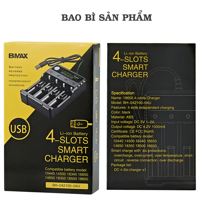 🔧 Thông số sản phẩm: - Sạc Pin Bmax đa năng cho pin : 18650, 18500, 18350, 16650, 16340, 14500, 10440 - Có đèn báo đỏ khi pin được sạc, báo xanh khi pin đầy ( Tự ngắt ) - Nguồn ra: DC 4.2V - 1A - Nguồn vào: DC 5V - 1A/2A ( Cổng USB ) - Kích thước: 120 x 60 x 34 (mm) - Số khe: 4 ( Có thể cắm 1 lúc 4, 3, 2 hoặc 1 quả pin ) - Bộ sản phẩm gồm: 1 sạc Pin Lưu ý: Bộ sạc chỉ dùng cho pin Li-on 3.7V như: Pin 18650, 18500, 18350, 16650, 16340, 14500, 10440 Bộ sạc không sạc cho pin sạc AA và AAA, Pin dùng 1 lần ( như pin Con Thỏ, Con Ó, Pinaco, Pin ALKALINE ...)