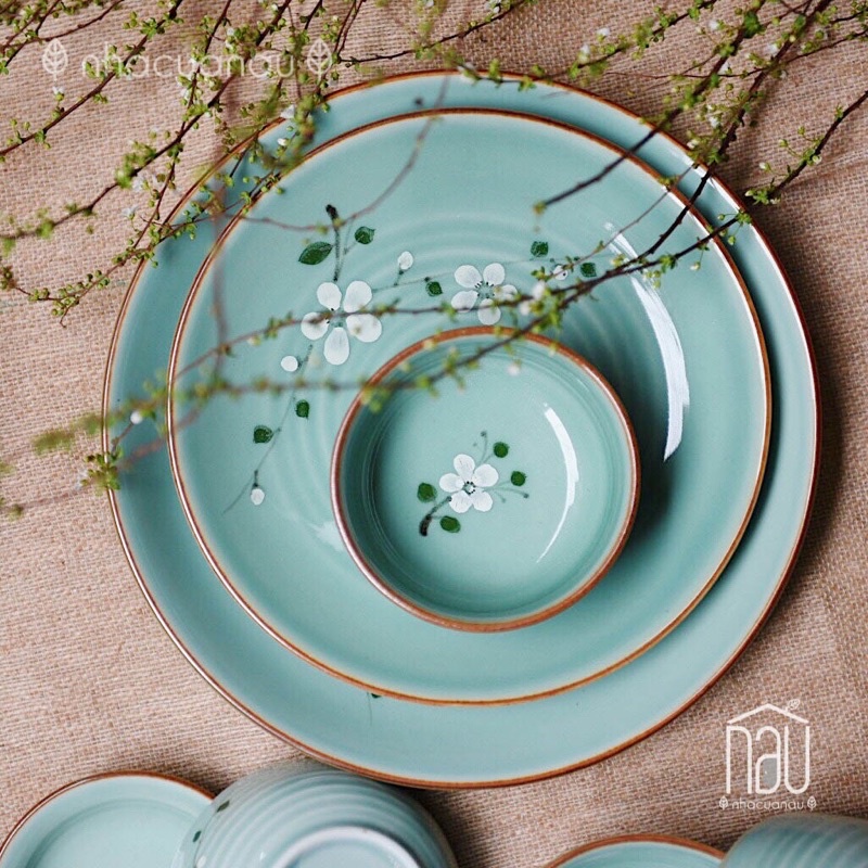 Bộ sản phẩm bát đĩa sứ Thanh Mai họa tiết cành mai trên chất liệu men ngọc phù hợp làm quà tặng tân gia quà cưới