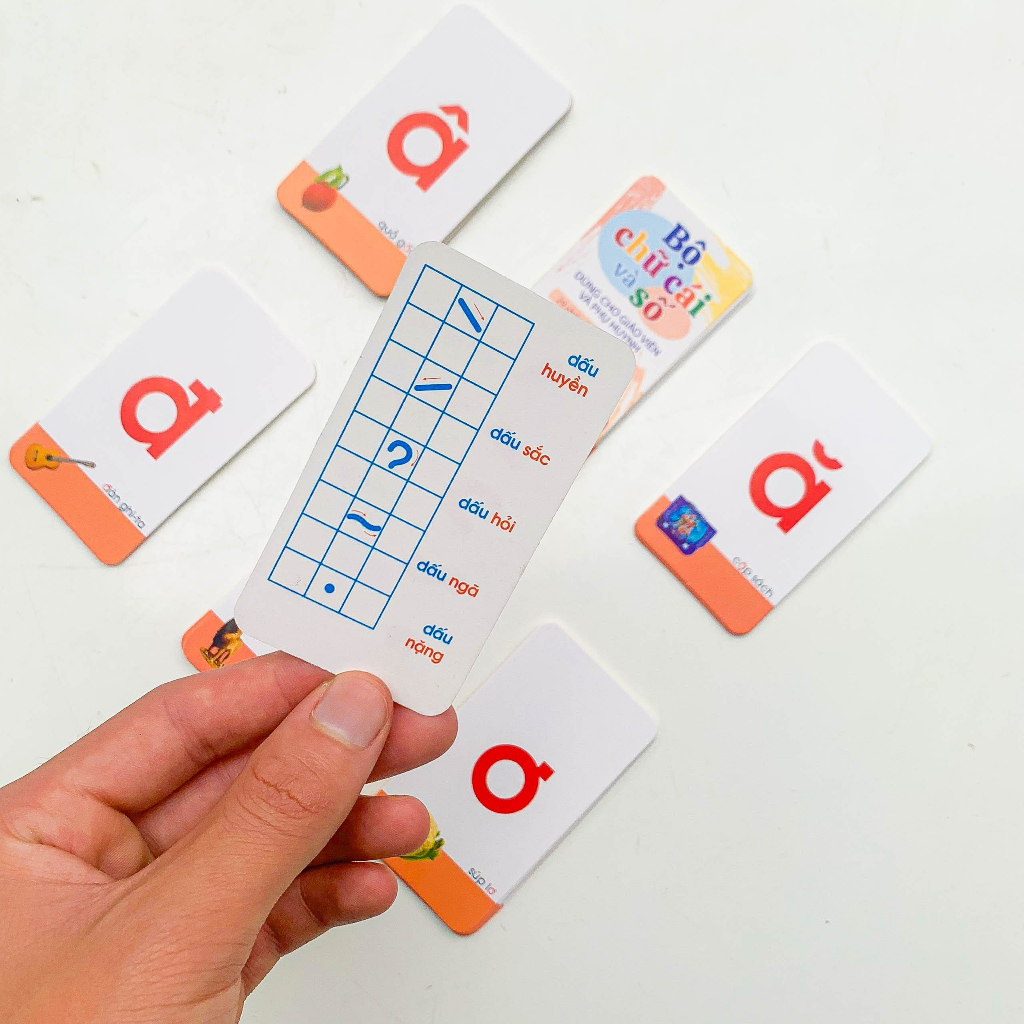 - Bộ Thẻ gồm 42 Thẻ Học gồm 29 Chữ Cái Tiếng Việt, 11 Số Học và 5 Thanh Dấu cho bé tập ghép chữ, ghép số trước khi vào lớp 1. - Được làm từ chất liệu giấy bìa cứng, chống lóa rất an toàn cho sức khỏe - Mặt trước là các chứ cái, số đếm và thanh dấu viết in đậm - Mặt s