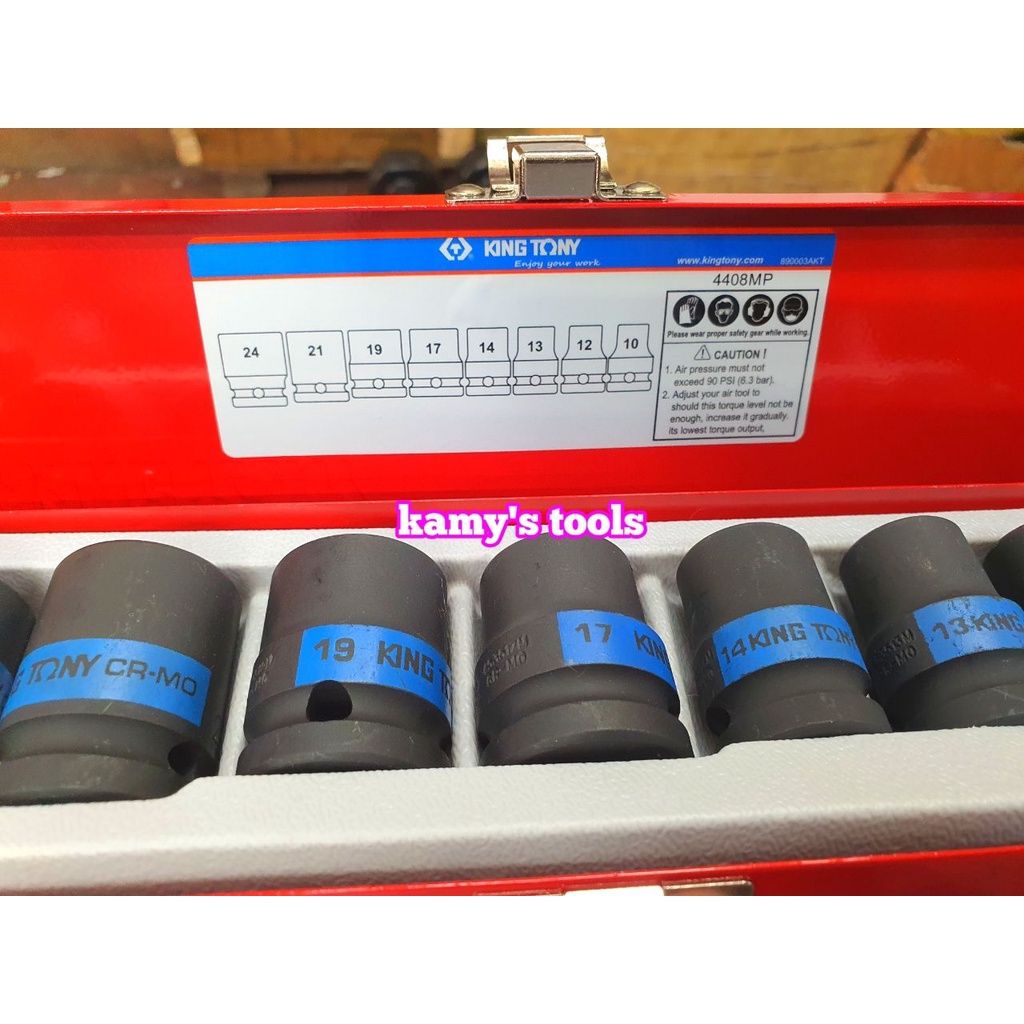 Bộ tuýp khẩu đen ngắn 1/2 inch Kingtony 4408MP 8 chi tiết 10mm-24mm [FREESHIP EXTRA] Thương hiệu: kingtony Xuất xứ: Đài Loan Model: 4408MP Chất liệu thép: CR-MO chuyên dùng cho các loại mở bulong khí nén xài hơi chịu được lực siết rất lớn Kích cỡ đầu tuýp: 10, 12, 13, 14 - 17, 19, 21, 24 mm Lục giác 6 cạnh Lỗ vuông: ½ inch tương đương 12.7mm Chiều dài: 38mm cho các đầu tuýp từ 10mm đến 19mm Chiều dài: 40mm cho các đầu tuýp 21mm và 24mm Hãy liên hệ với kamytools để biết thêm thông tin chi tiêt sản phẩm Bộ tuýp khẩu đen ngắn 1/2 inch Kingtony 4408MP 8 chi tiết 10mm-24mm